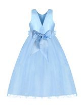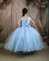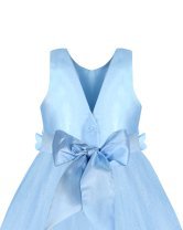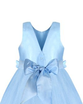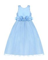 100% polyester dress, sleeveless, back neckline and bundle of flowers with pearls.