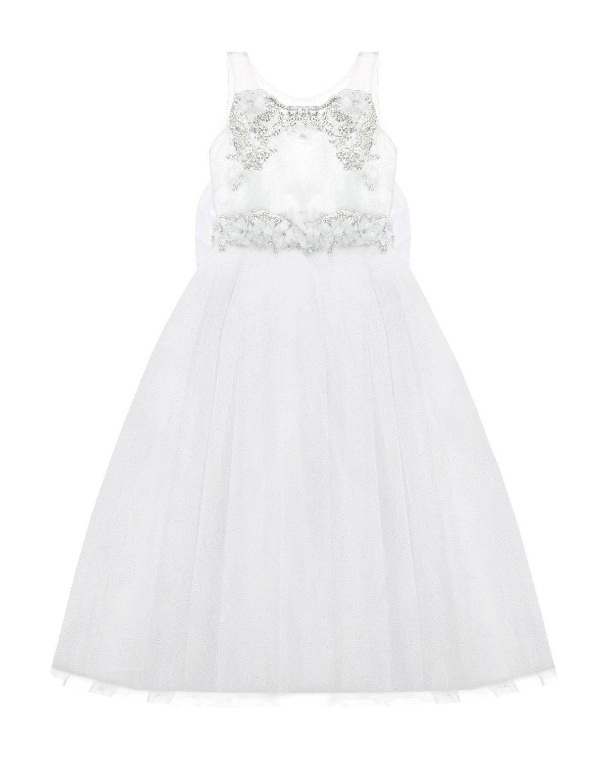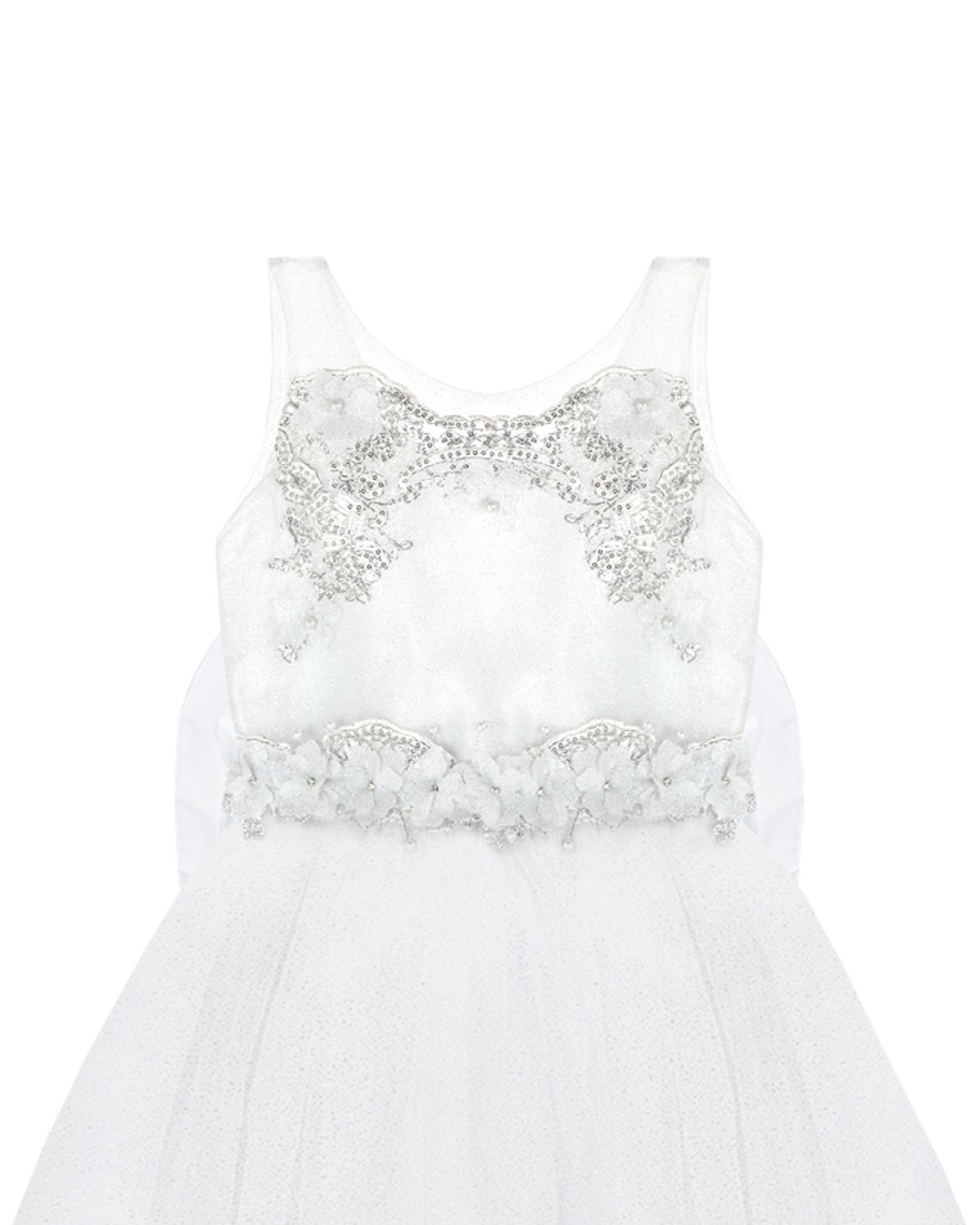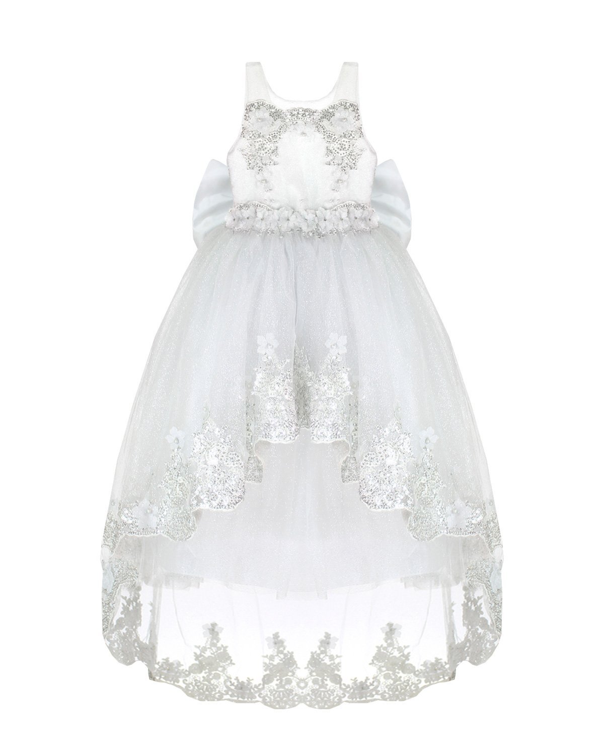 Vestido de primera comunión para niña elaborado de forro, velo, glitter brillante de alta calidad, cenefa en plata en la parte posterior, cauda desmontable y acabado de flor 3D.