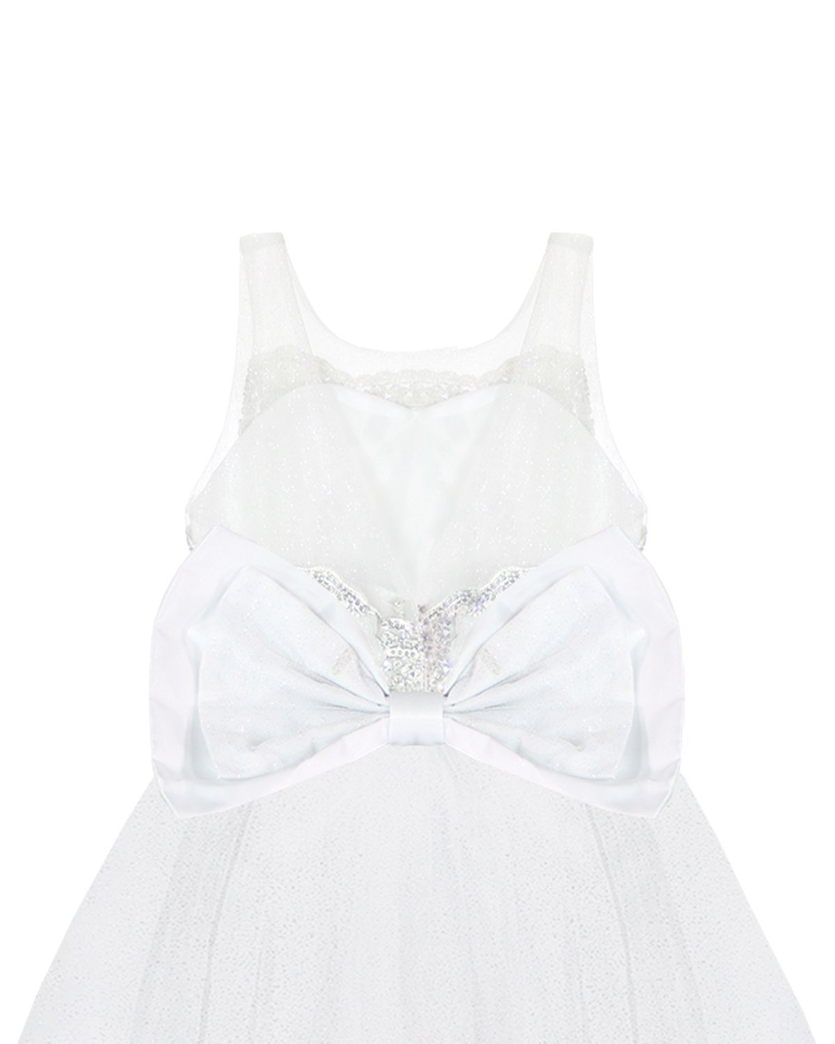 Está elaborado de forro de alta calidad, con un velo y glitter brillante que agregan un toque de brillo y glamour al vestido. Una cenefa en color plata en la parte posterior agrega un toque de sofisticación. El vestido cuenta con una cauda desmontable que se puede ajustar según las necesidades de la niña.