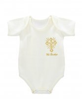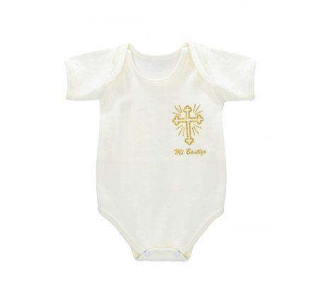 Pañalero de manga corta para niño con logo "Mi Bautizo". Elegante, cómodo y perfecto para la celebración del bautizo.