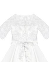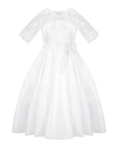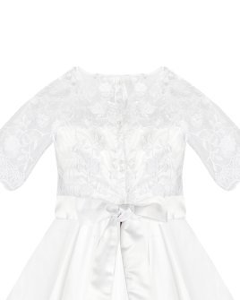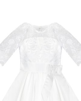 The Nancy communion dress model offers an elegant and refined option, made with high-quality materials including Bridal Satin for both the skirt and blouse. The small bow on the blouse and the detailed embroidery on the short sleeves add charm to this beautiful garment.