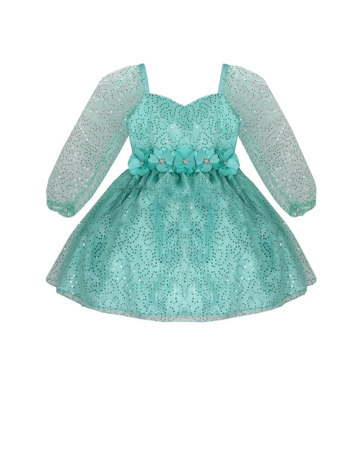 Vestido corto para niña de lentejuela tejida en maya y forro de poliéster, con mangas largas, escote en forma de corazón y detalles de flores 3D.