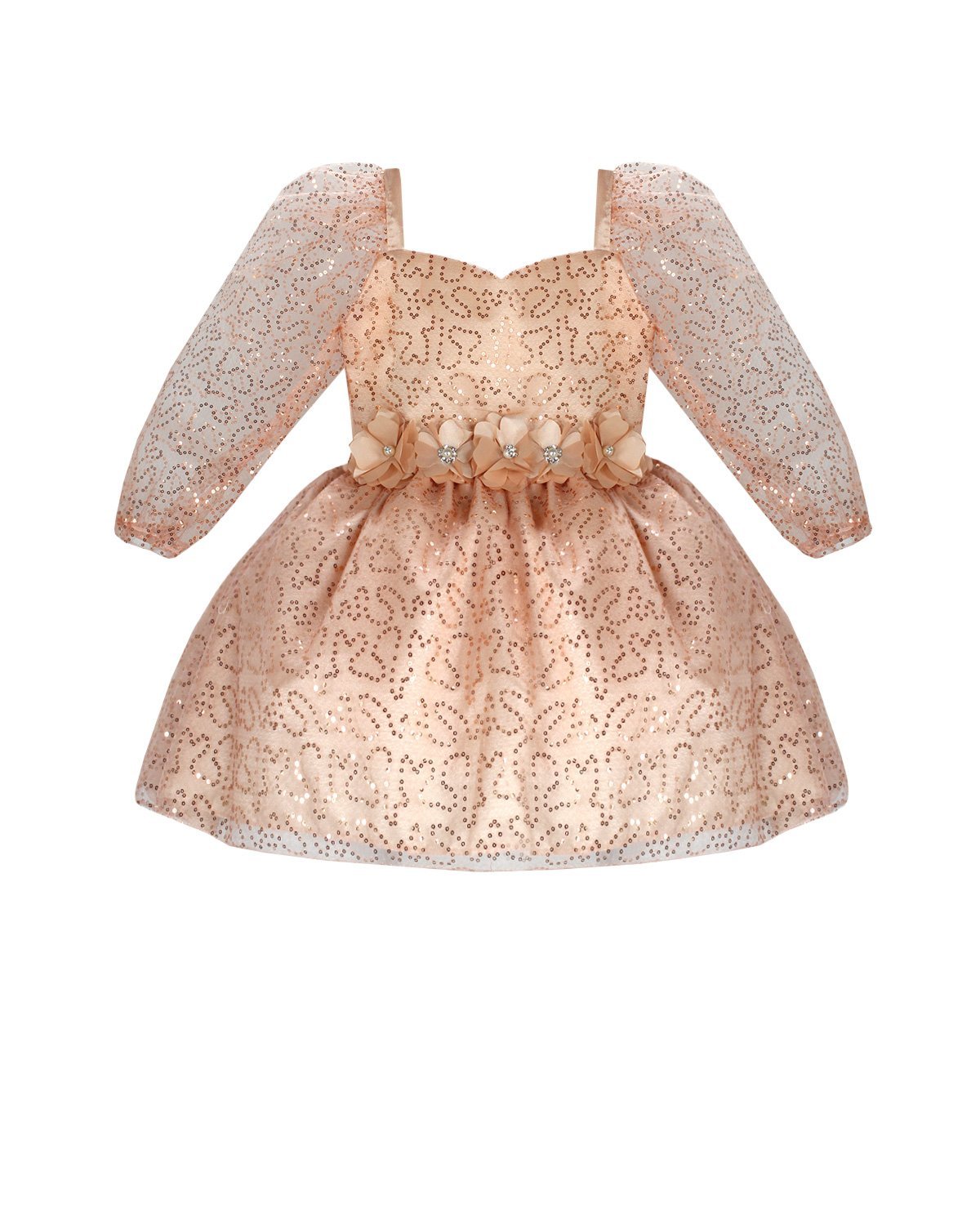 Vestido corto para niña de lentejuela tejida en maya y forro de poliéster, con mangas largas, escote en forma de corazón y detalles de flores 3D.