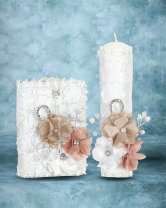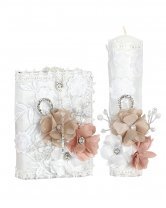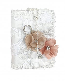 The First Communion Kit Style Arisbeth is a charming set that includes a Bible, a candle, and a rosary adorned with embroidery, 3D flowers, pearls, rhinestones, and a light embroidery on the edges. It is perfect to accompany this special moment.