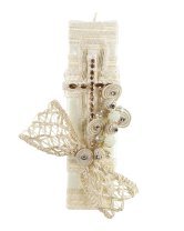 Alberto Baptism Kit, with candle, shell, and cloth adorned with ribbons, embroidered borders, pearls, and rhinestones. Available in white and beige.