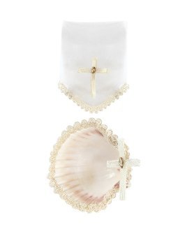 The Alberto Baptism Kit is a unique set that blends tradition with elegant details. It includes a candle, shell, and cloth, all wrapped in fine ribbons and embroidered borders that enhance its design. Each piece is adorned with pearls and rhinestones, adding a sophisticated touch. The candle features a delicate cross, while the cloth, decorated with ribbons and a cutwork bow, completes this harmonious set. Available in classic white and beige, this kit is perfect for making this significant occasion even more special.