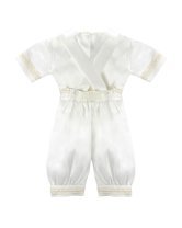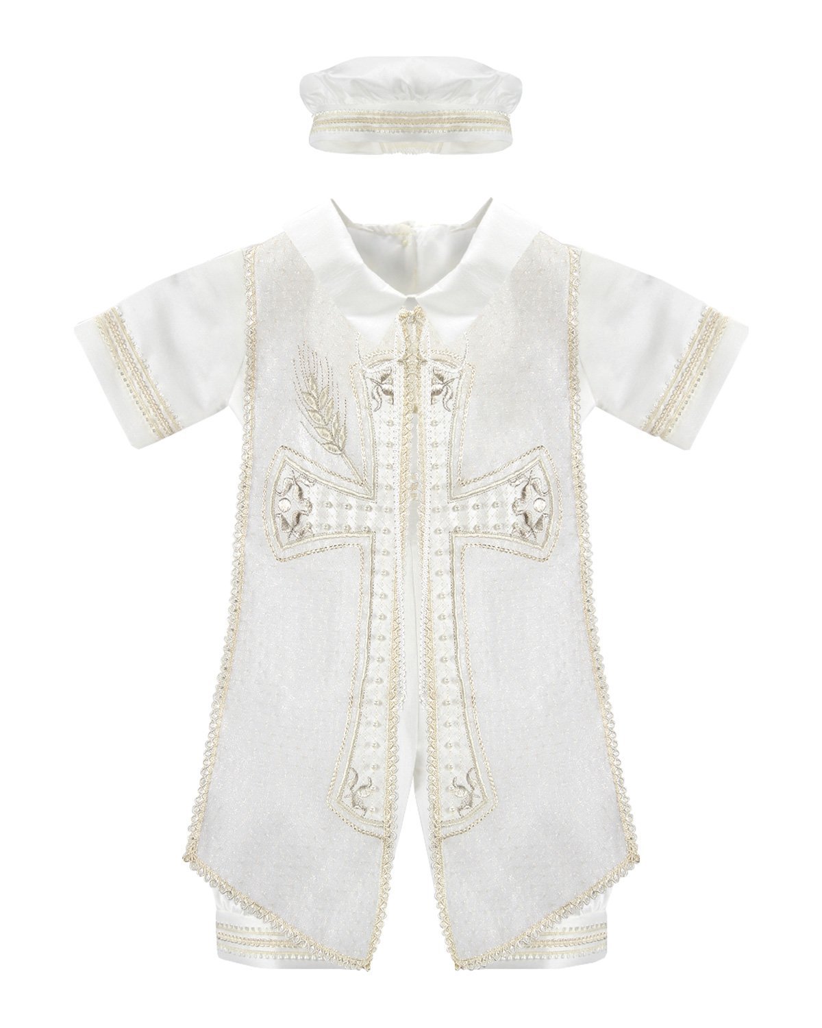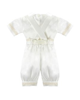 Elegant shantu outfit with puffed shorts, decorative shirt, and a stole with rhinestones, pearls, cross and wheat embroidery, and edge trim.