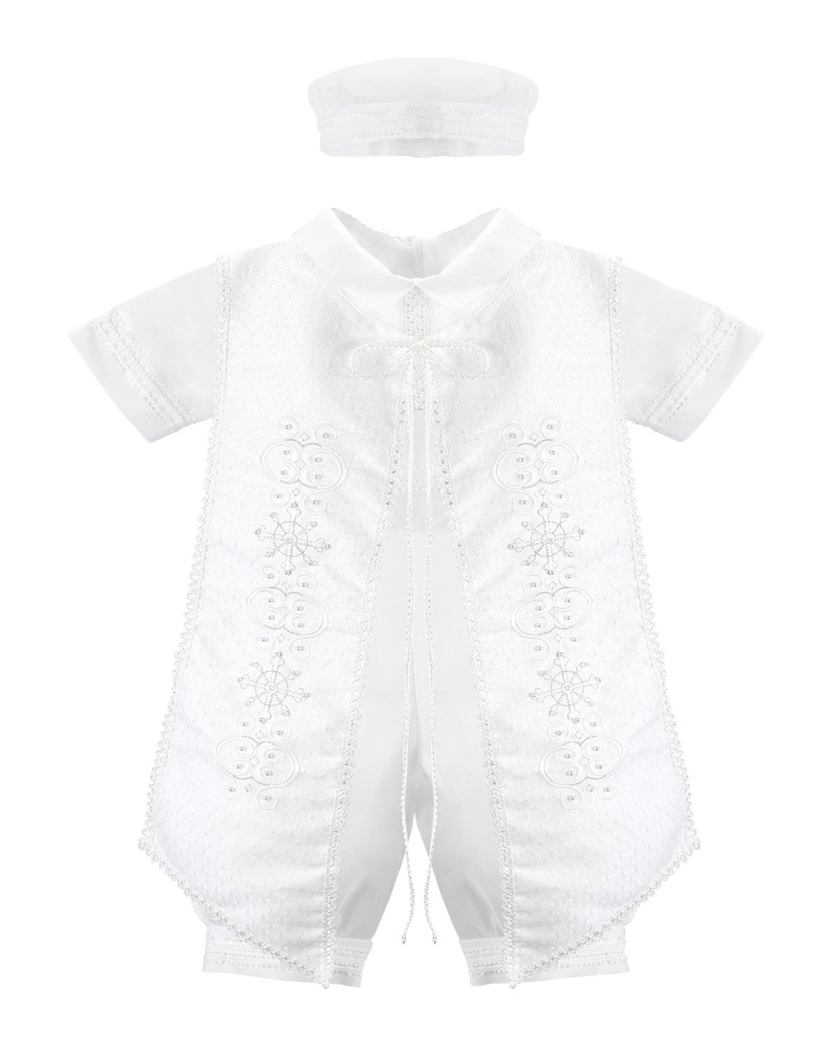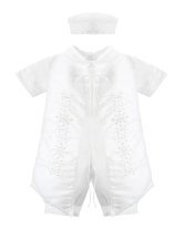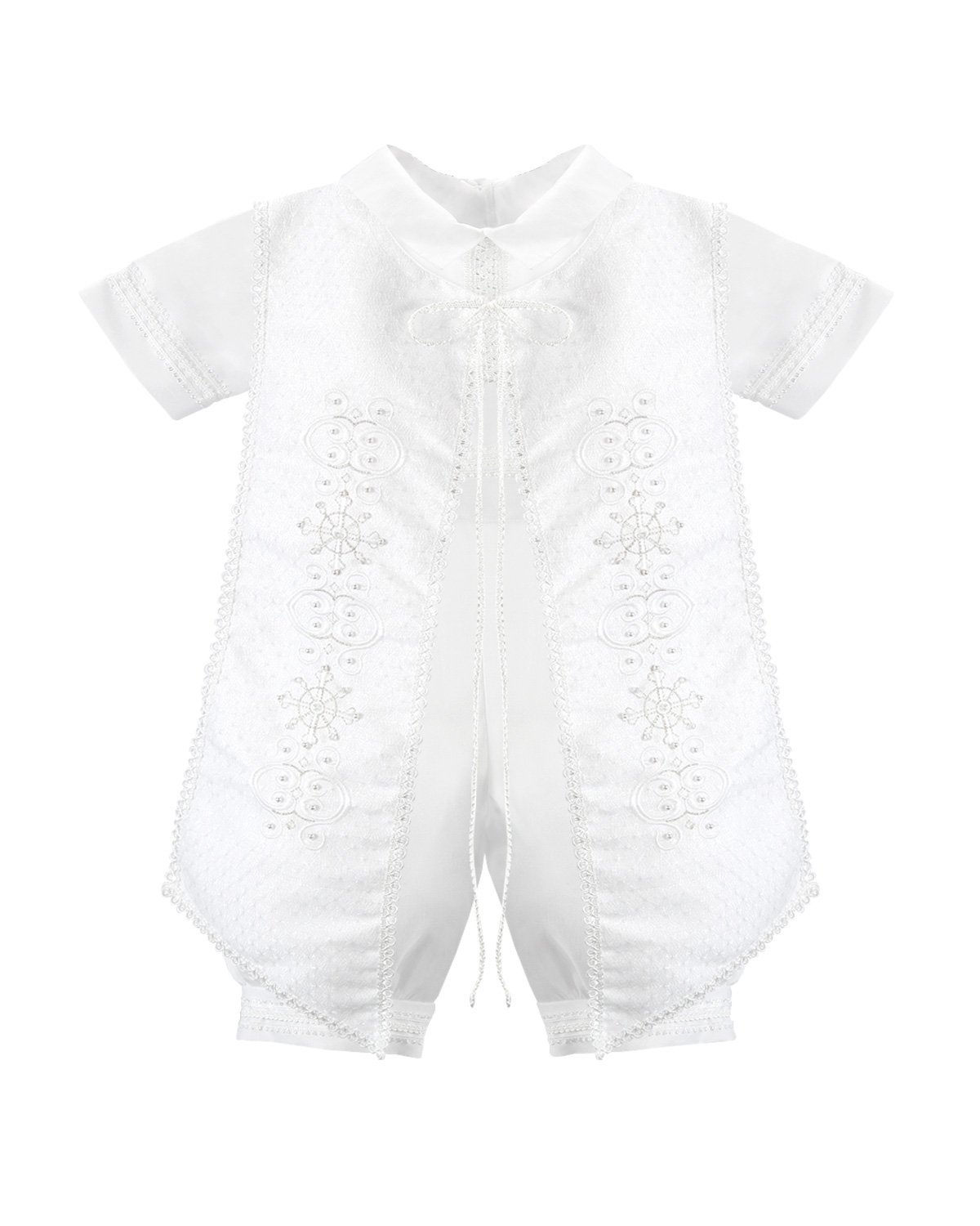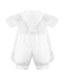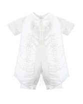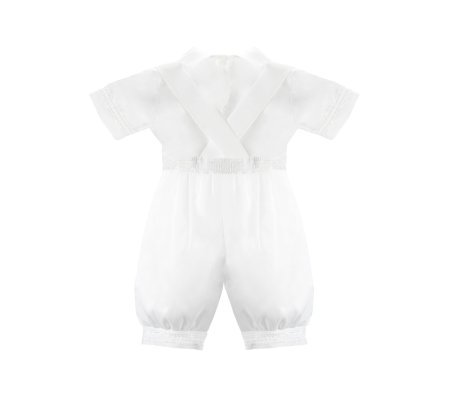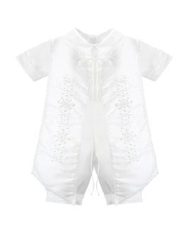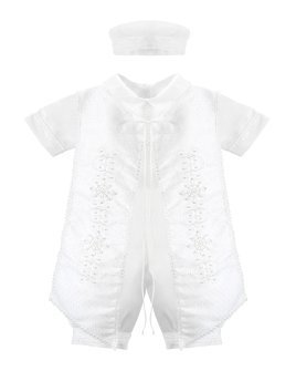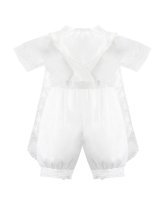 Elegante conjunto de bautizo en shantu con short, camisa decorada, y estola con pedrería, perlas y tul bordado con figuras religiosas.
