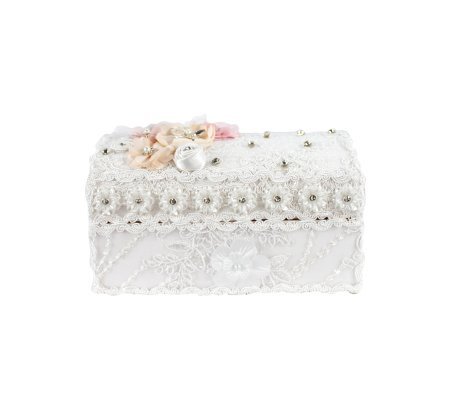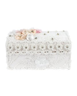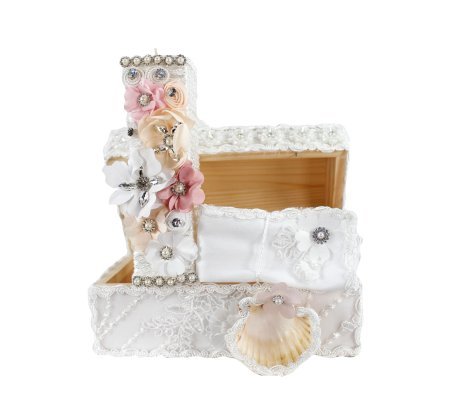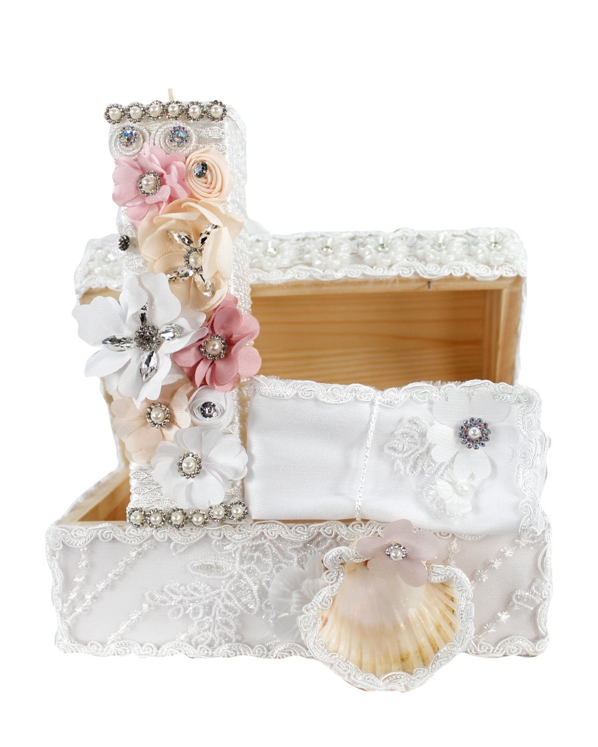 El Kit Baúl de Bautizo Modelo Selene incluye vela, concha, paño y baúl decorado con encaje, perlas y pedrería, perfecto para una ceremonia especial.