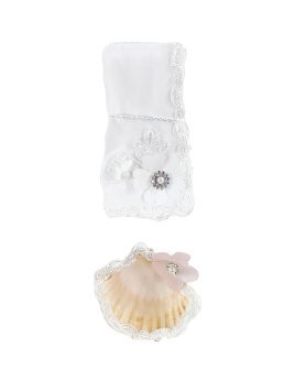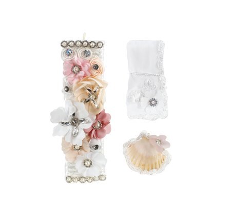 El Kit Baúl de Bautizo Modelo Selene es un conjunto elegante y simbólico, ideal para una ceremonia de bautizo especial. Incluye una vela decorada con encaje, perlas y detalles florales, una concha adornada con perlas y aplicaciones brillantes, un delicado paño bordado y un hermoso baúl forrado con encaje y detalles sofisticados. Diseñado para aportar un toque de distinción y elegancia a este momento único.