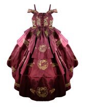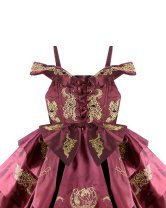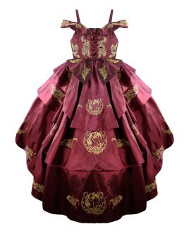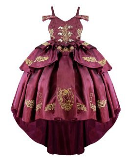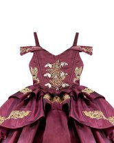 Imponente y detallado, el Vestido de Niña Modelo Charro está confeccionado en tafeta de alta calidad, con una falda amplia de doble capa y cauda. Su diseño destaca por los bordados en tono dorado con elementos inspirados en la tradición charra: herraduras, caballos y flores, distribuidos a lo largo del vestido para un efecto visual armonioso. La blusa incluye tirantes delgados y mangas caídas decoradas, que realzan el estilo único de esta pieza.