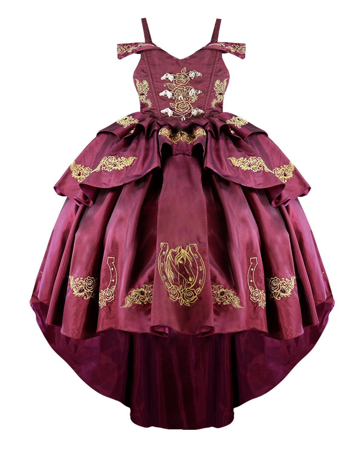 Vestido de niña en tafeta con cauda, bordado dorado de herraduras, caballos y flores. Modelo Charro.