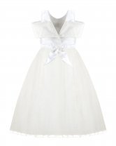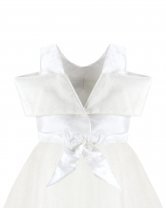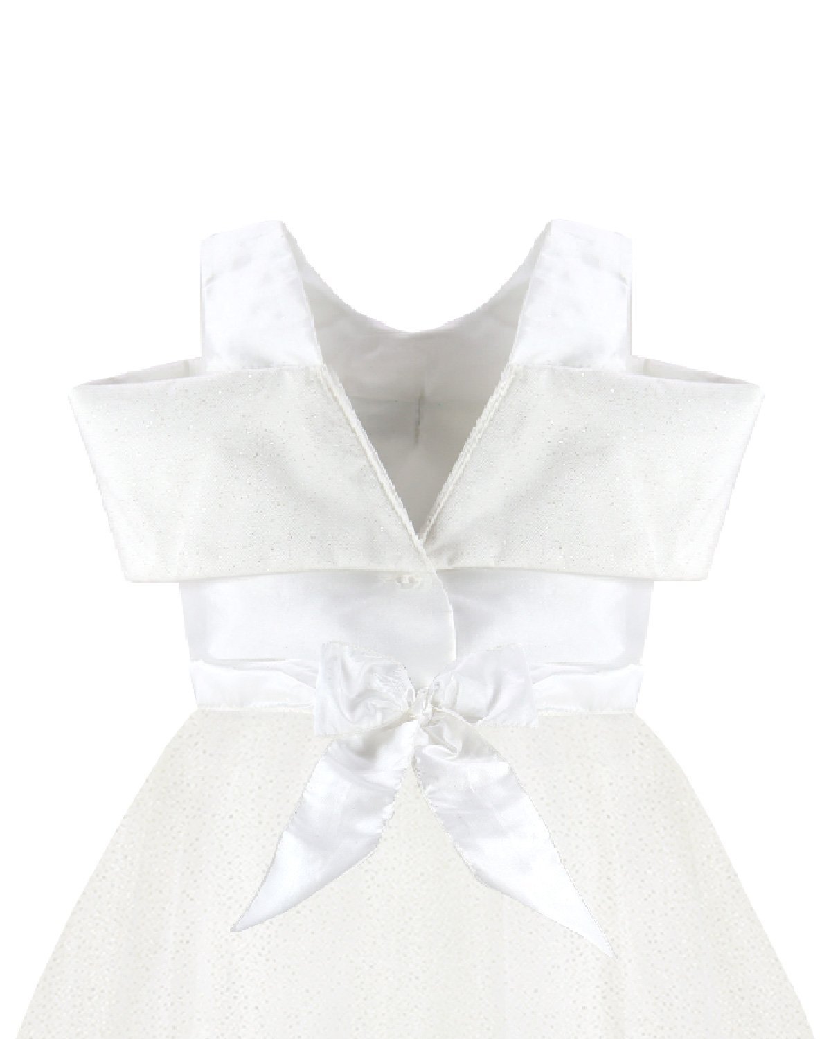Vestido de niña en tafeta y tul, con moño tipo hombro caído, falda amplia y cinturón con pedrería. Modelo Alhelí.
