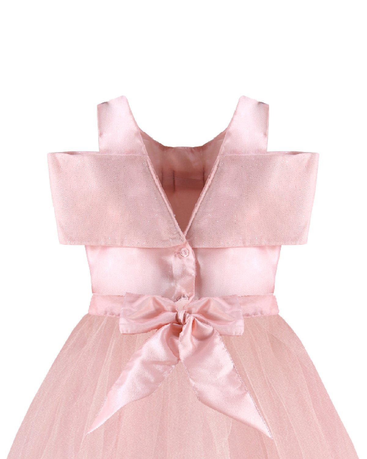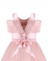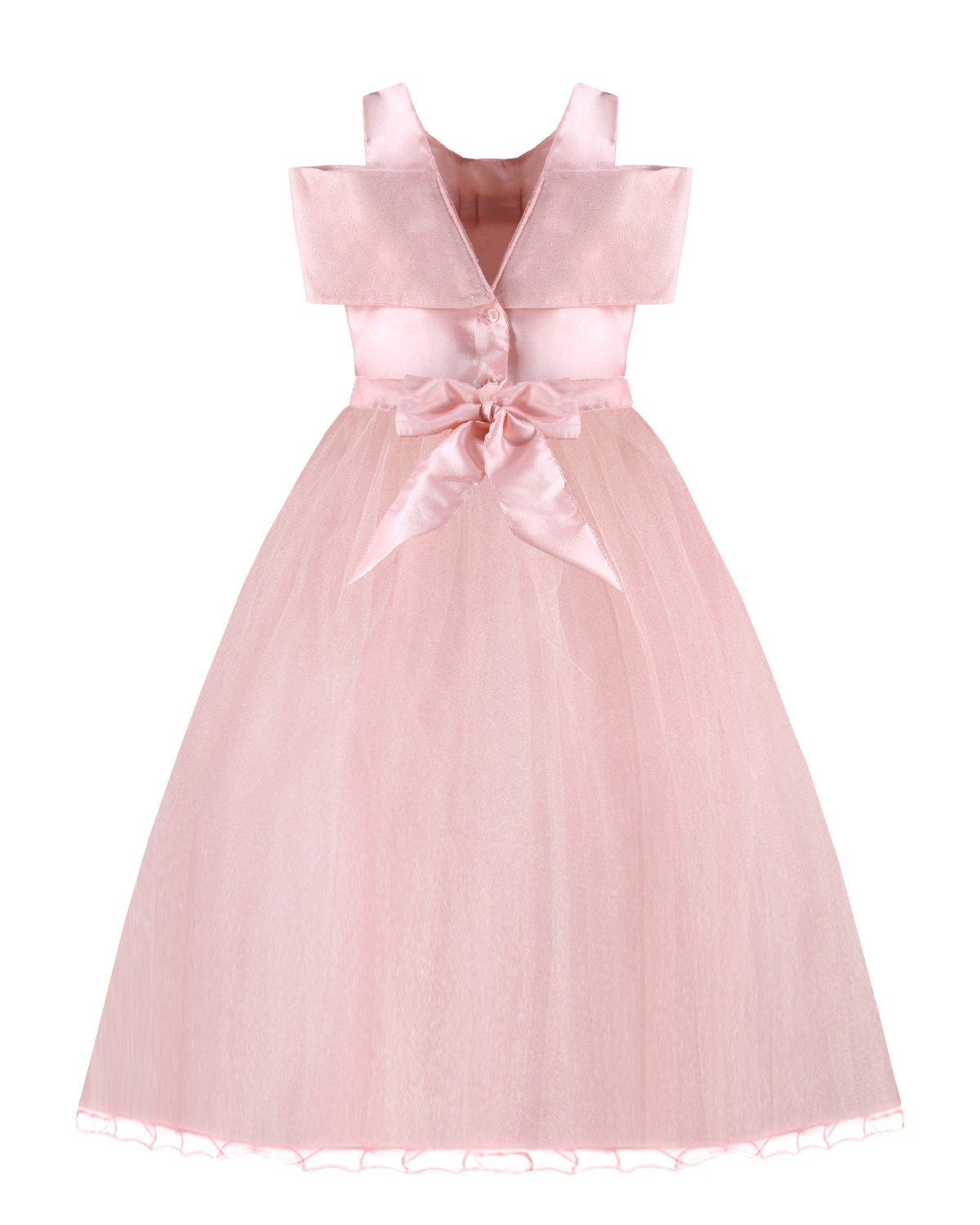 Vestido de niña en tafeta y tul, con moño tipo hombro caído, falda amplia y cinturón con pedrería. Modelo Alhelí.