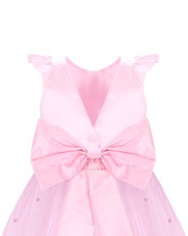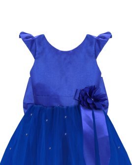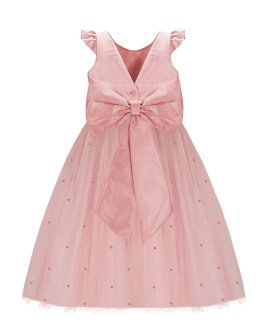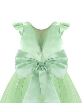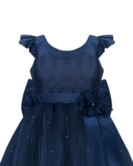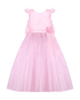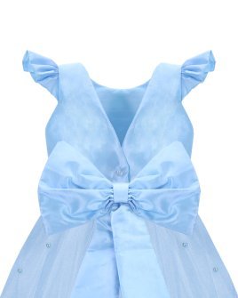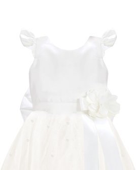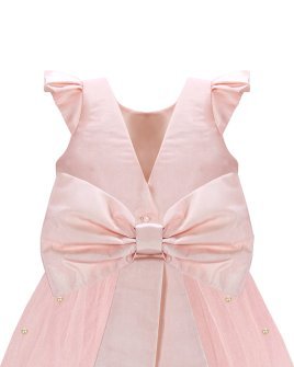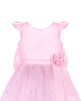 Vestido de niña elegante, tul en la falda con detalles de perlas y en la blusa flor elegante con moño grande en la parte de la espalda.