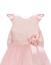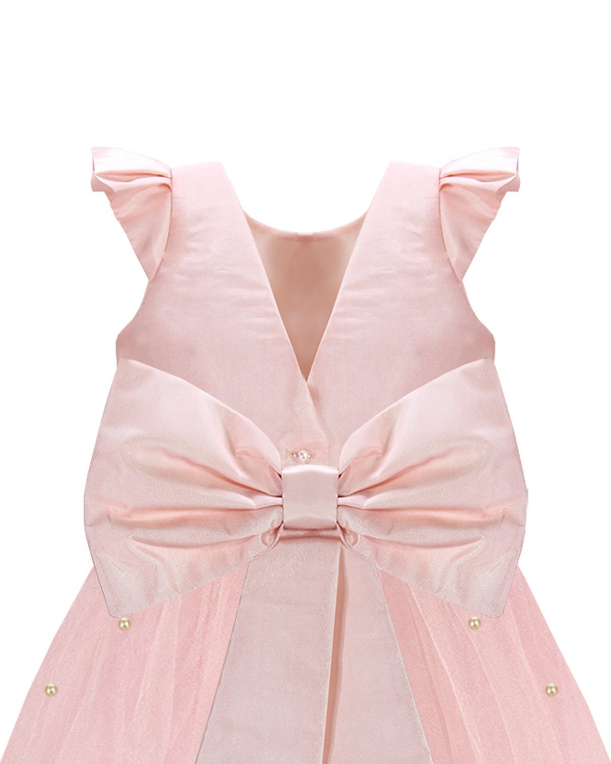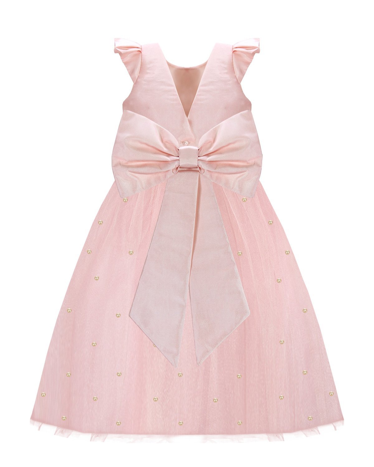 Vestido de niña elegante, tul en la falda con detalles de perlas y en la blusa flor elegante con moño grande en la parte de la espalda.