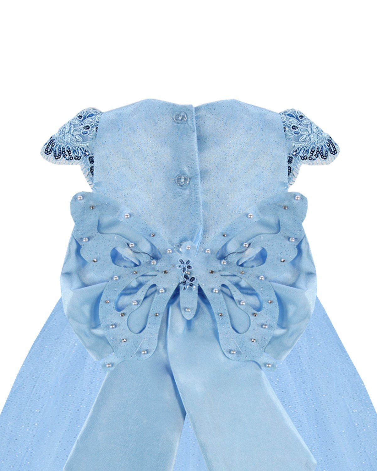 El vestido de fiesta para bebé de Maylin es una prenda única y elegante, elaborada con forro, velo, glitter y bordado de encaje en la blusa. Su característica más distintiva es la mariposa en la parte trasera que simula un moño, lo que lo hace perfecto para cualquier ocasión especial.