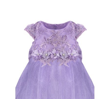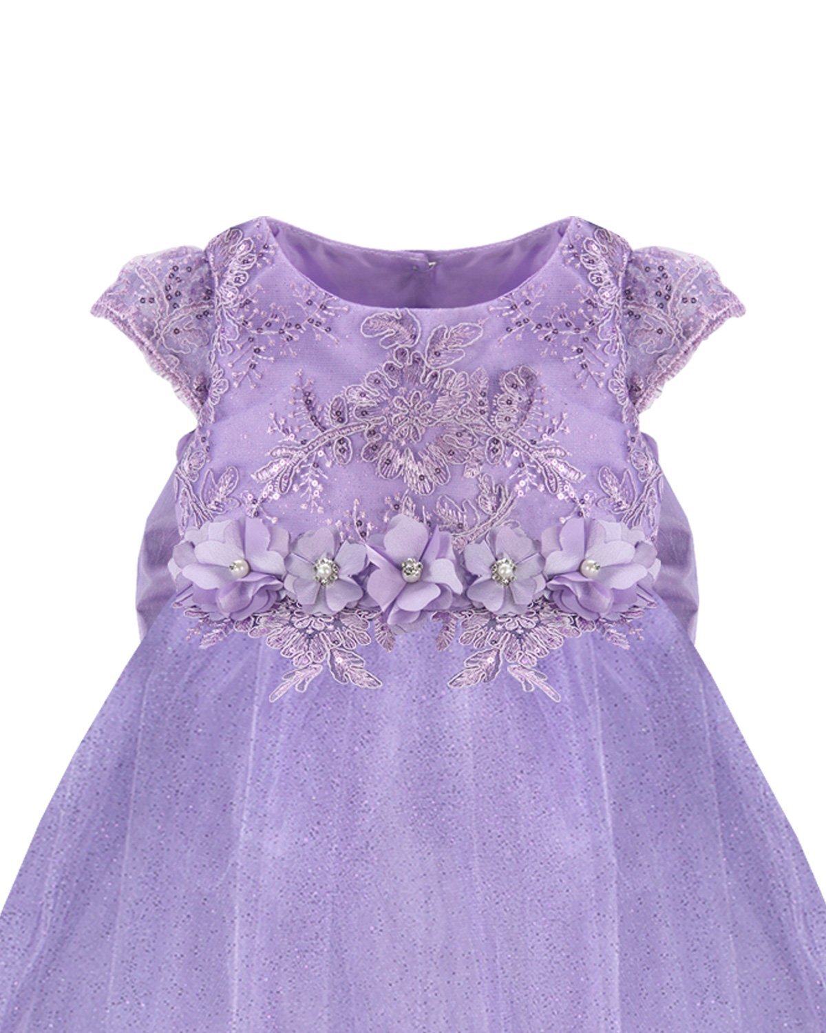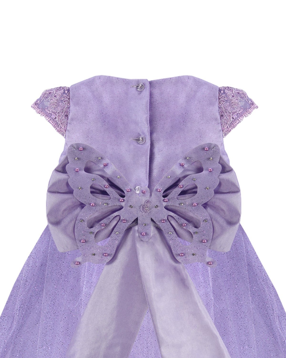 El vestido de fiesta para bebé de Maylin es una prenda única y elegante, elaborada con forro, velo, glitter y bordado de encaje en la blusa. Su característica más distintiva es la mariposa en la parte trasera que simula un moño, lo que lo hace perfecto para cualquier ocasión especial.