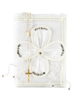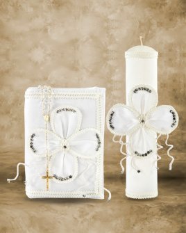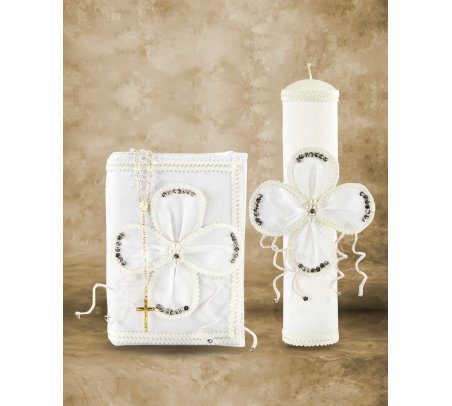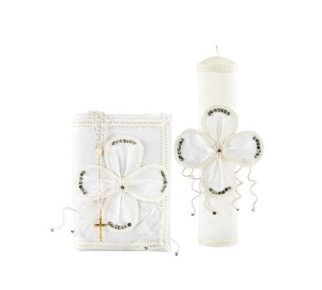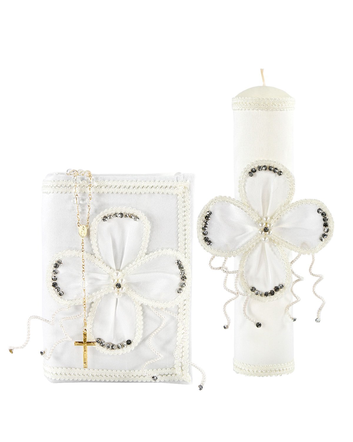 El Kit de Primera Comunión Modelo Alexander es el complemento perfecto para celebrar este sacramento especial. Este kit incluye una hermosa biblia, una vela y un rosario, todos diseñados con cuidado y atención al detalle. Tanto la biblia como la vela están decoradas con una elegante cruz bordada, adornada con perlas y pedrería, así como un delicado bordado en los bordes de la vela y la biblia, añadiendo un toque de elegancia y belleza a cada pieza.