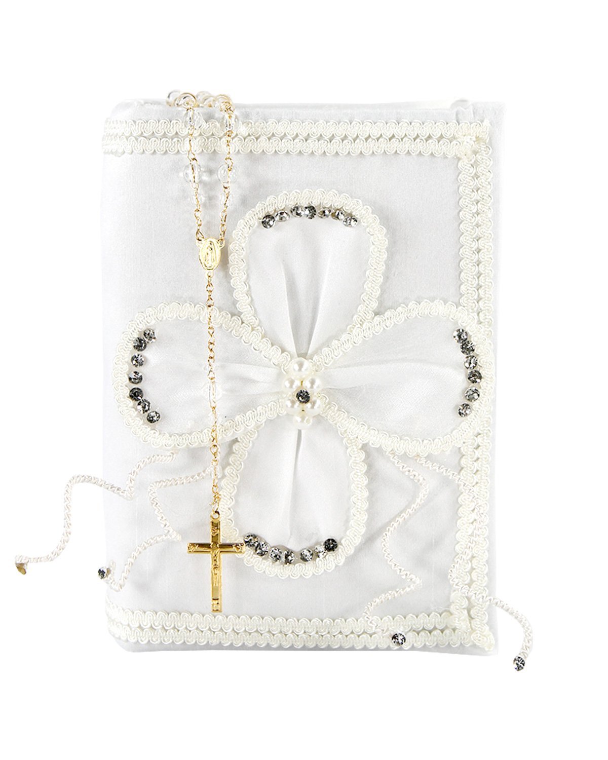 El Kit de Primera Comunión Modelo Alexander es un conjunto encantador que incluye una biblia, una vela y un rosario decorados con una cruz bordada, perlas, pedrería y bordados en los bordes. Es perfecto para acompañar este momento especial.