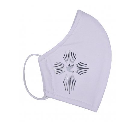 Cubrebocas de Primera Comunión Gael: decorado con un elegante sublimado de una cruz de rayos y una paloma al centro, simbolizando la luz y la paz para un día especial.