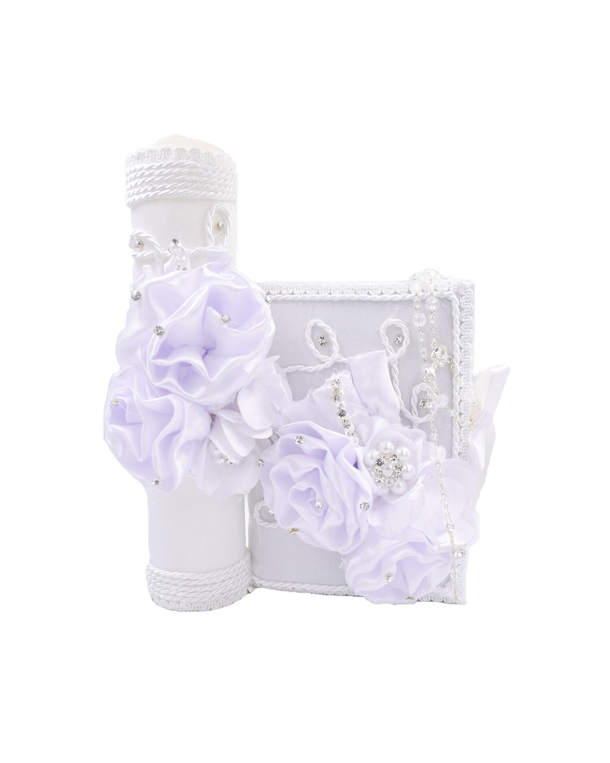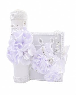 The Lucy Style First Communion Kit features a beautifully decorated bible and candle, adorned with a bouquet of 3D flowers, pearls, and gemstones, embroidery on the edges, and a side bow to close the bible. It's the perfect complement for such a special occasion like First Communion.