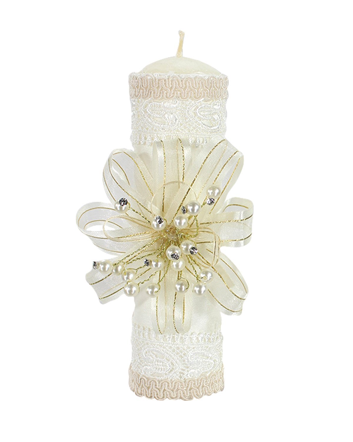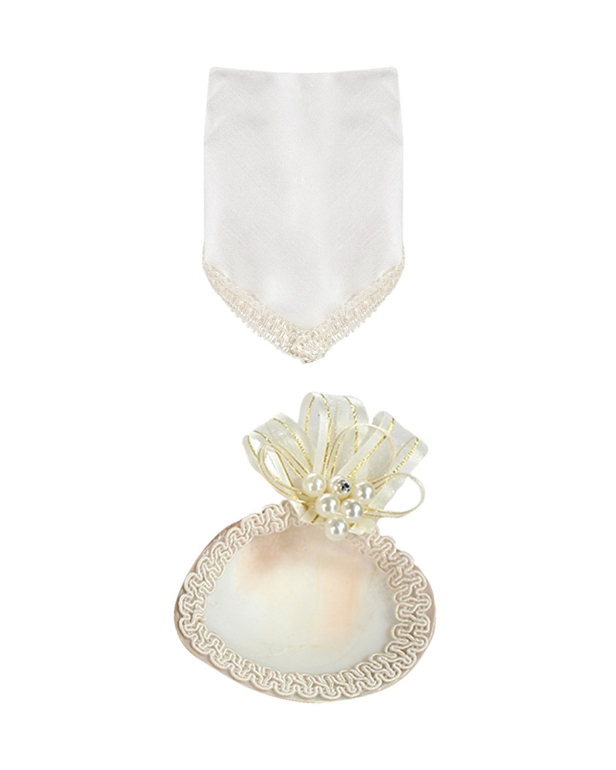 Kit de Bautizo Damian con vela, conchita y paño decorados con bordado, moño de listones con perlas y pedrería.