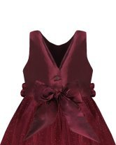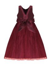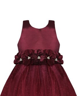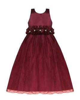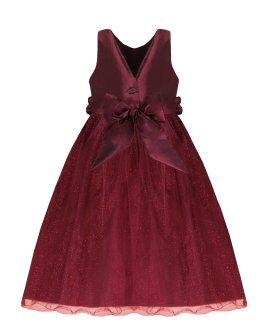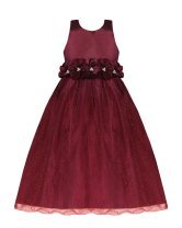 100% polyester dress, sleeveless, back neckline and bundle of flowers with pearls.