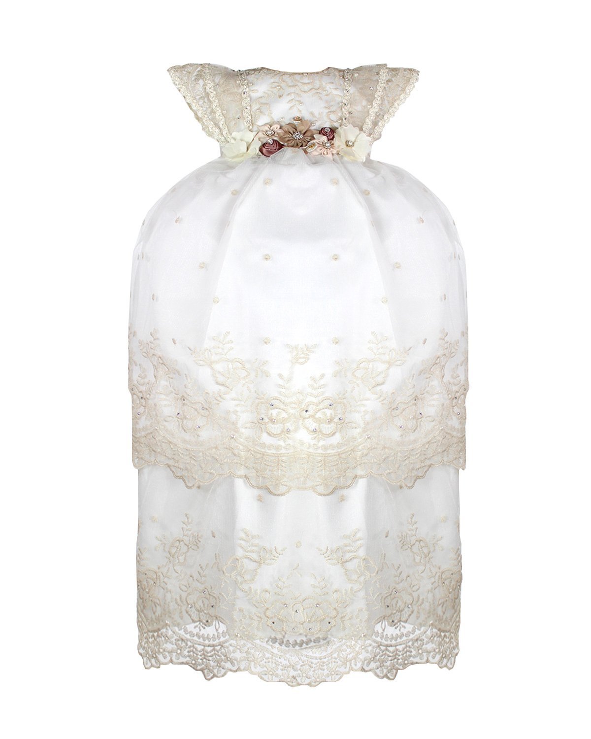 Christening gown for a girl made in shantung with lace sleeves and beading, frontal decoration in soft colors. Exclusive Maylin brand.