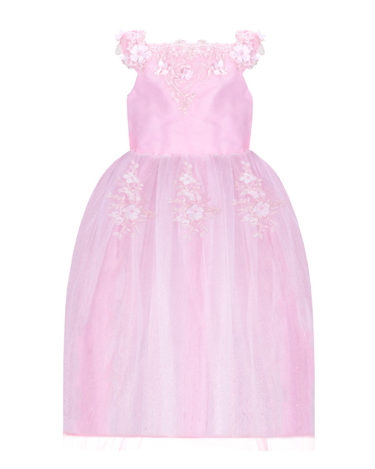 Elegant Girl's dress with embroidery and 3D flowers with pearls, tulle skirt and blouse with dropped sleeves.