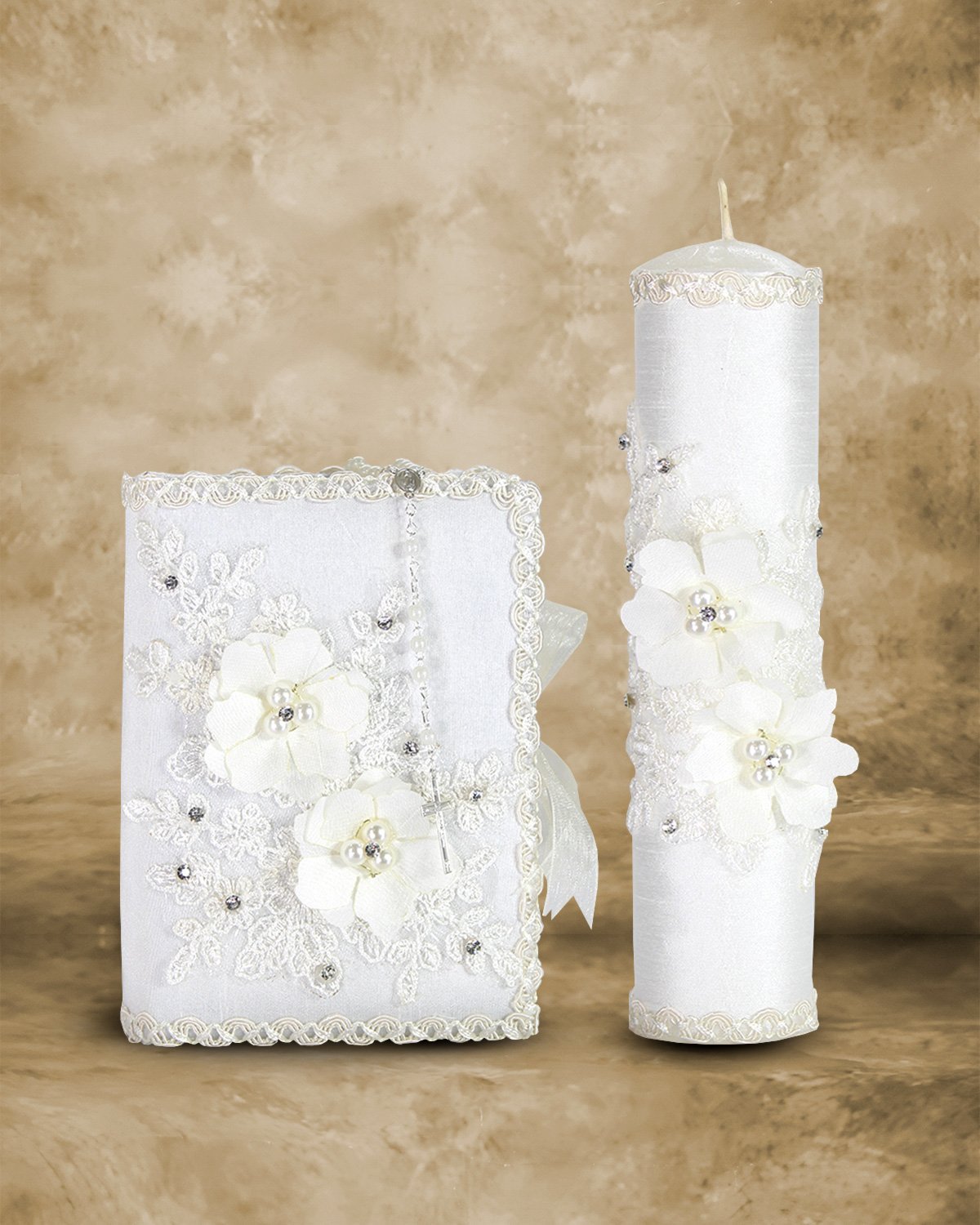 El Kit de Primera Comunión modelo Alexa es el complemento perfecto para la celebración de este sacramento especial. Este kit incluye una preciosa biblia, una vela y un rosario, todo diseñado con cuidado y atención a los detalles. Tanto la biblia como la vela están adornadas con hermosas flores en relieve en 3D, delicados bordados y pedrería, lo que añade un toque de elegancia y belleza a cada pieza.
