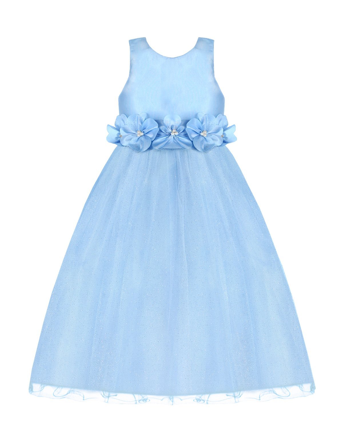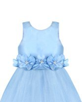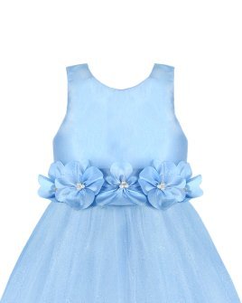 100% polyester dress, sleeveless, back neckline and bundle of flowers with pearls.