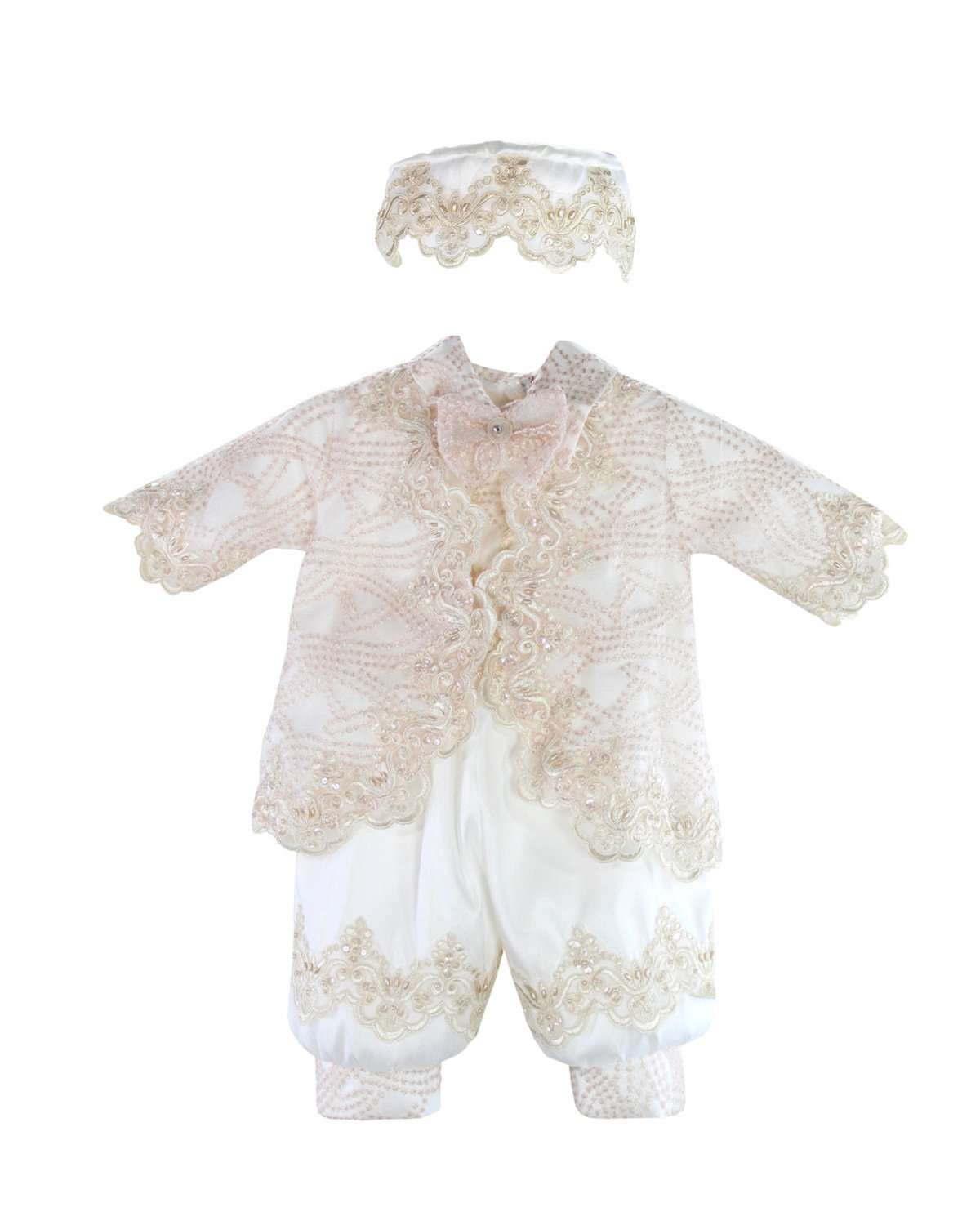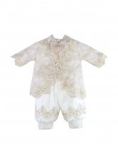 Maylin's boy's robe is made of shantung and features fine embroidery, sequin and pearl embroidered band, and Louis XV-inspired design.