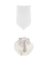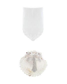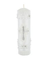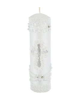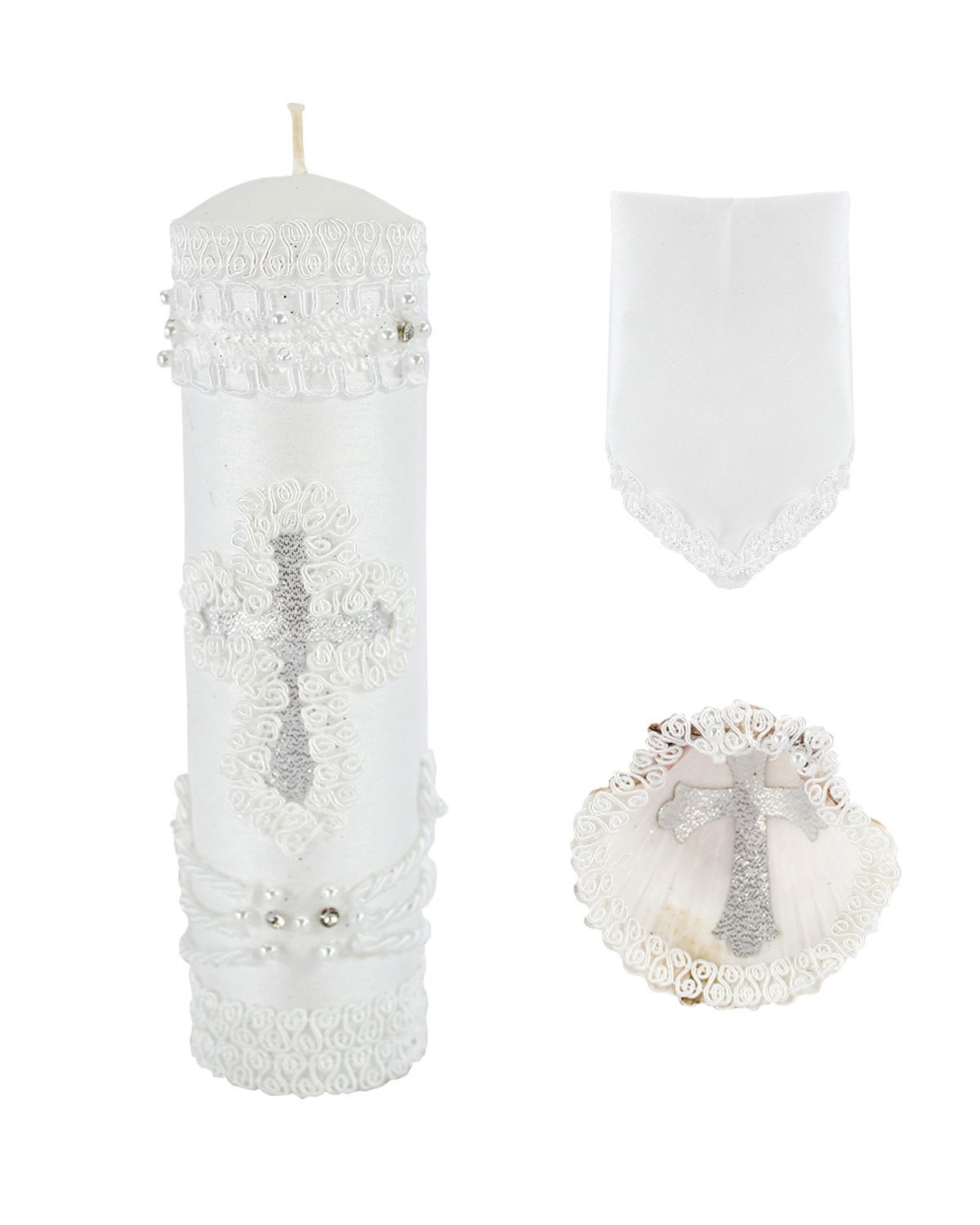 The Noe Baptism Kit offers elegance and meaning for your loved one's baptism. It includes a candle, a shell, and a cloth, with the candle wrapped in fabric, decorated with embroidery, rhinestones, and pearls, and a ribbon cross at the center.
