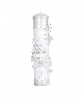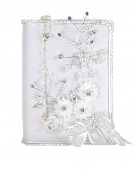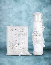 The First Communion Kit in Guadalupe Style features a bible, a candle, and a rosary adorned with shantung, ribbons, and 3D ribbon flowers, complemented with pearls and rhinestones. These elegant details enhance the beauty of each element, making it the ideal choice for a meaningful religious occasion.