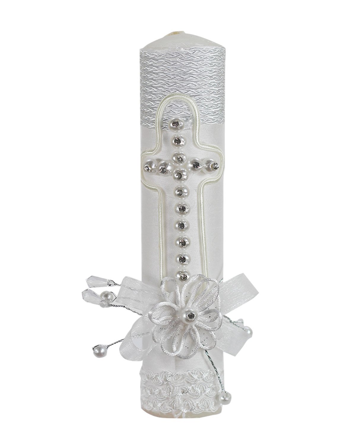 Kit de Primera Comunión Modelo Silvia: Un conjunto completo que incluye biblia, vela y rosario, decorados con una elegante cruz de perlas y pedrería, una flor 3D y bordados detallados. El regalo perfecto para celebrar este momento sagrado y especial.