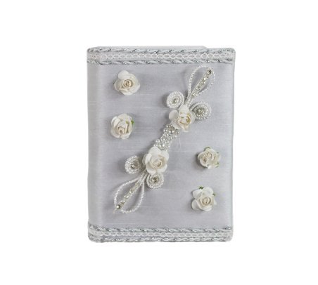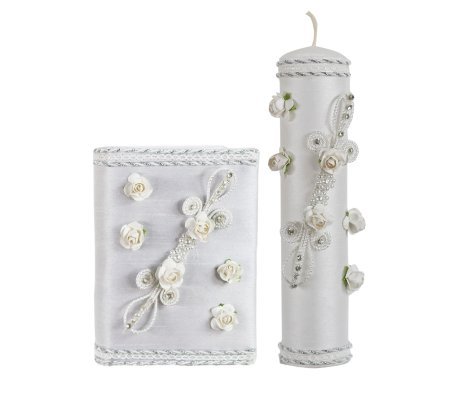 El Kit de Primera Comunión Modelo Luisa presenta una biblia y una vela bellamente decoradas, con un delicado bordado en los bordes y un adorno de perlas y pedrería, incluyendo algunas flores formadas por estos materiales brillantes.