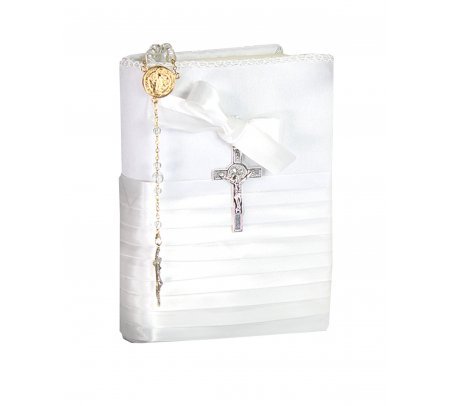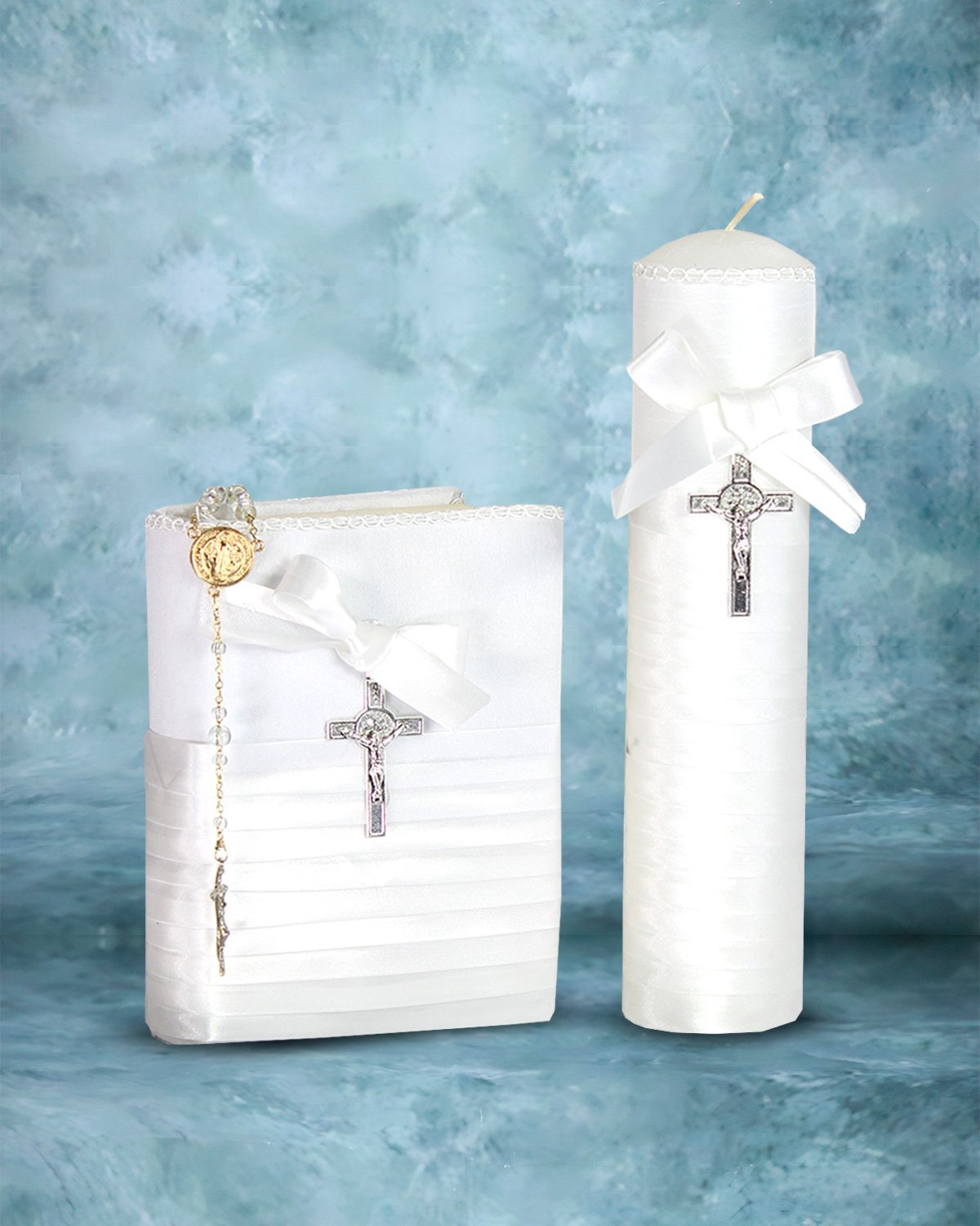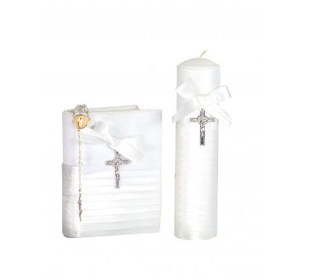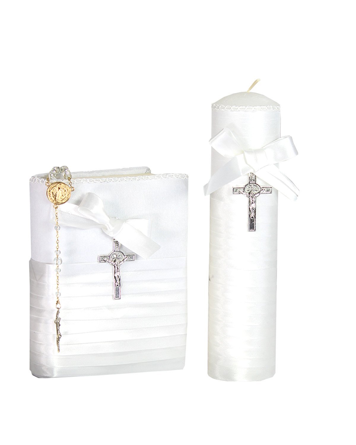 Descubre nuestro Kit de Primera Comunión Modelo Eterno, que incluye una biblia, una vela y un rosario adornados con listones, un crucifijo en el centro y un pequeño moño. Celebra este evento sagrado con estilo y elegancia.