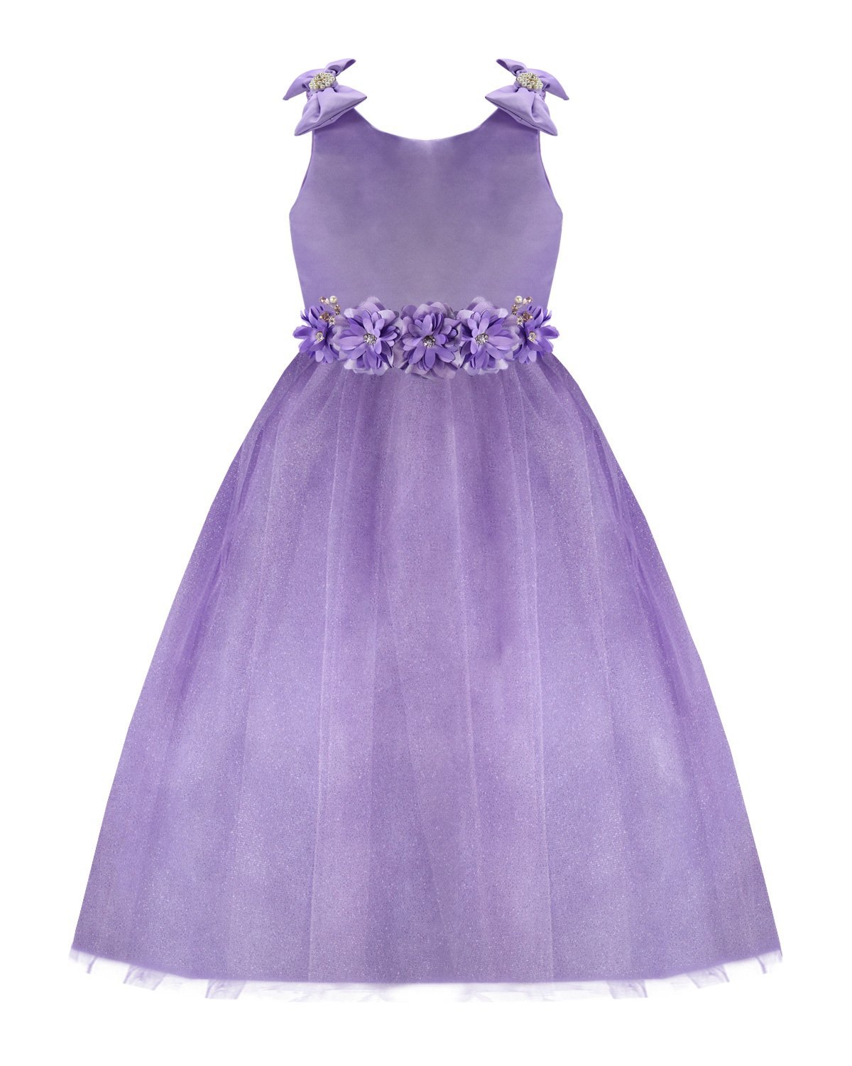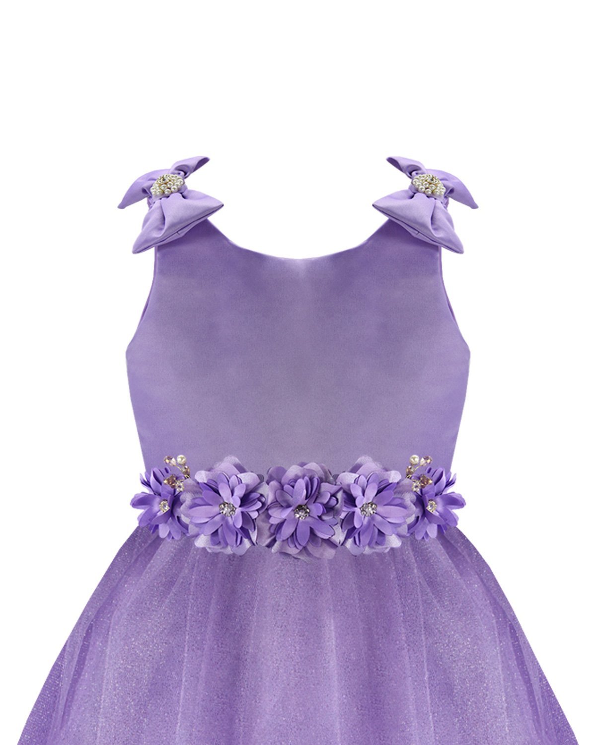 Girl’s dress made of satin, glitter tulle, and lining, featuring a round neckline, 2D flower waistband, bows on the shoulders, V-cut back, and a double-layered glitter tulle skirt.