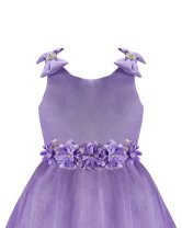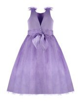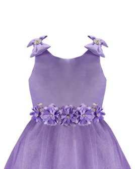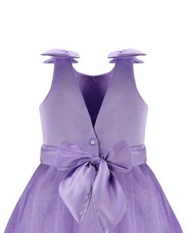 Girl’s dress made of satin, glitter tulle, and lining, featuring a round neckline, 2D flower waistband, bows on the shoulders, V-cut back, and a double-layered glitter tulle skirt.