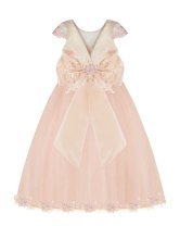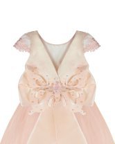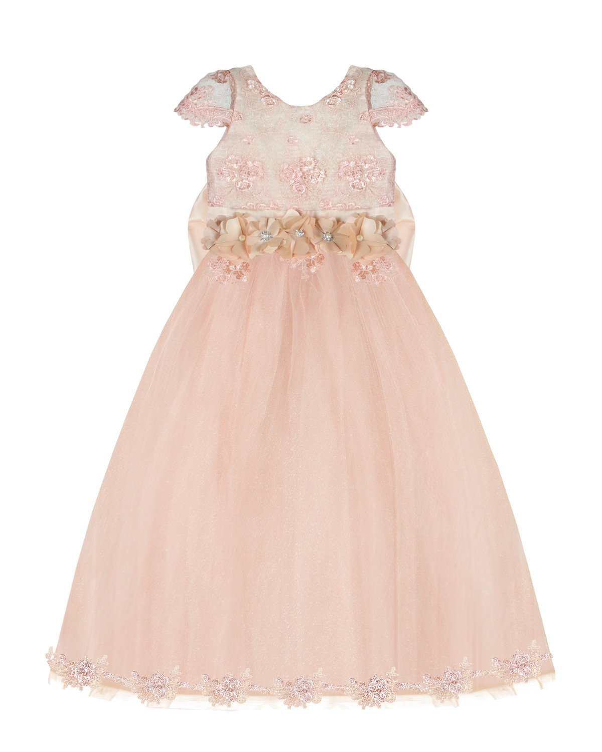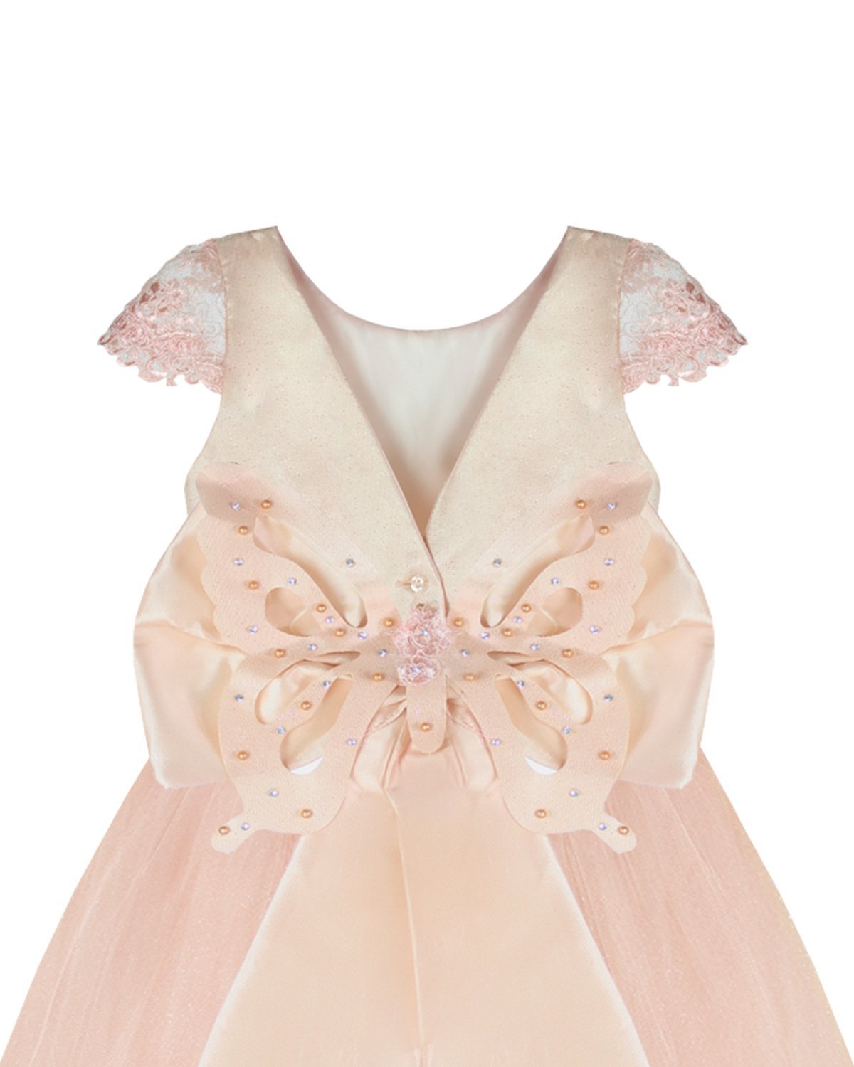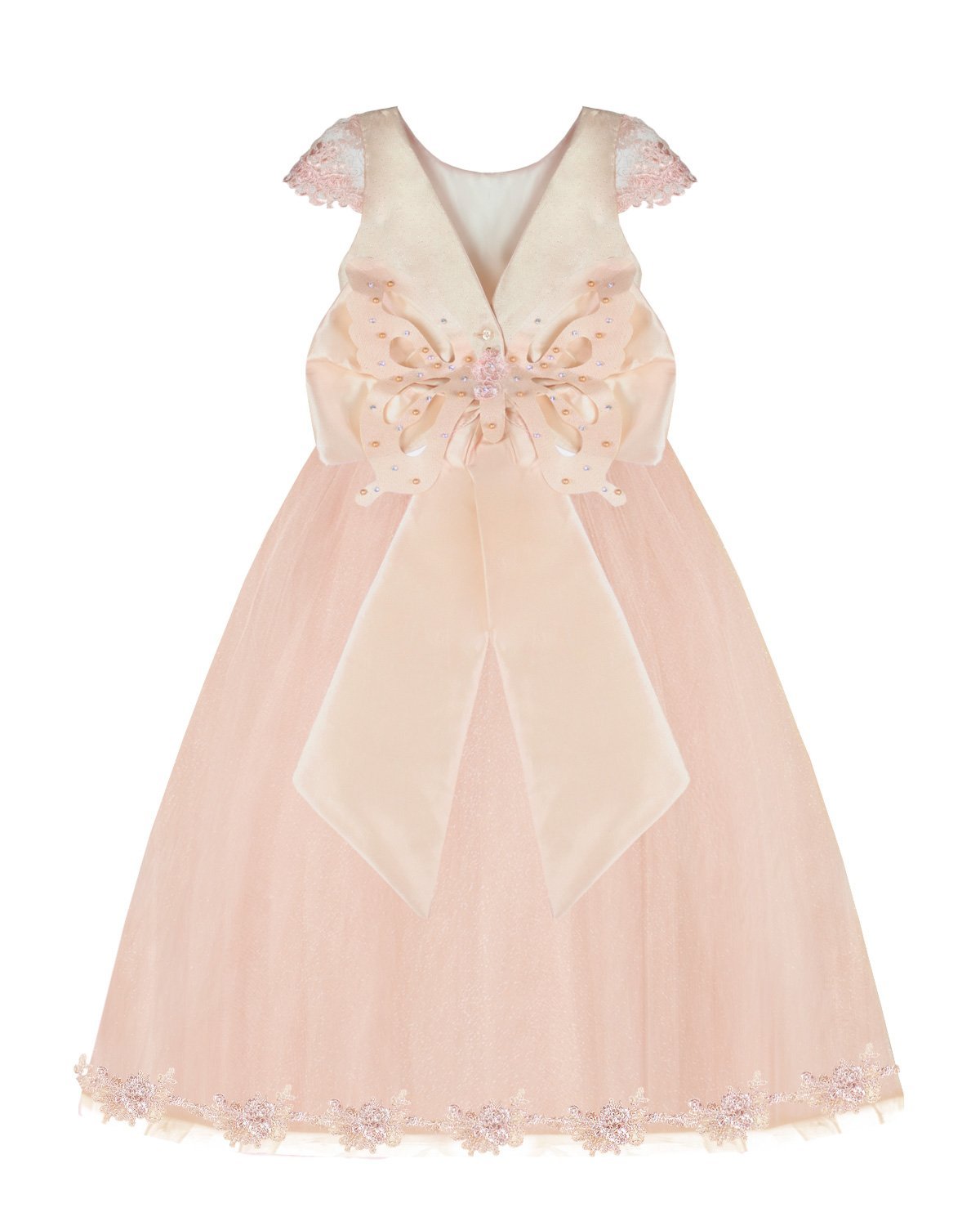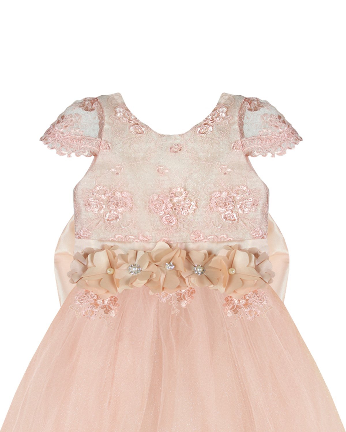 Vestido de Niña elegante, tul Glittel con bordado y flores, moño en forma de mariposa con perlas y cristal.