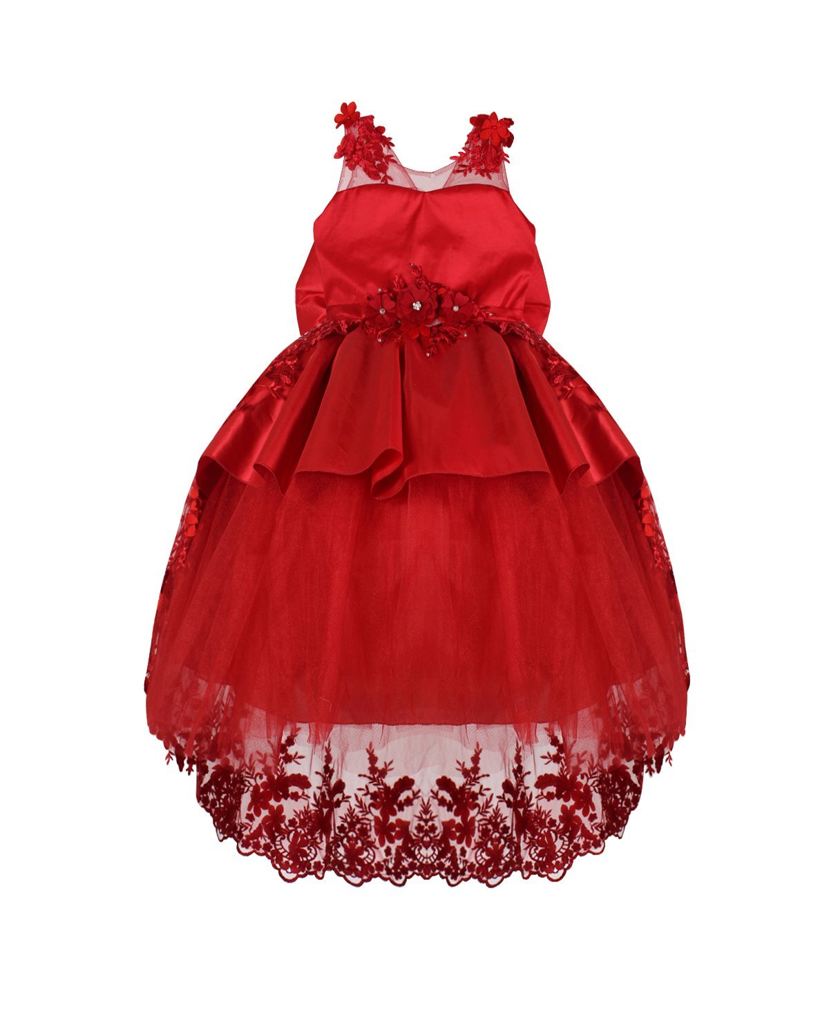 Girl's party dress made of taffeta with lining and veil. It has a detachable tail and a unique design to make the girl look beautiful.
