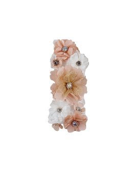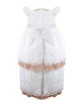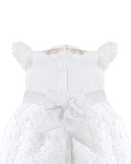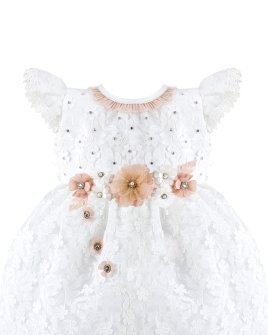 Shantung baptism gown with embroidered tulle overlay, ruffled skirt, 3D floral front with pearls and rhinestones. Marina model.