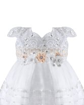 Ropón de Bautizo modelo Yoselin, confeccionado en shantung y tul bordado con pasamanerías en la falda. Blusa con bordado y fajo de flores 3D con pedrería, mangas cortas y diadema a juego.