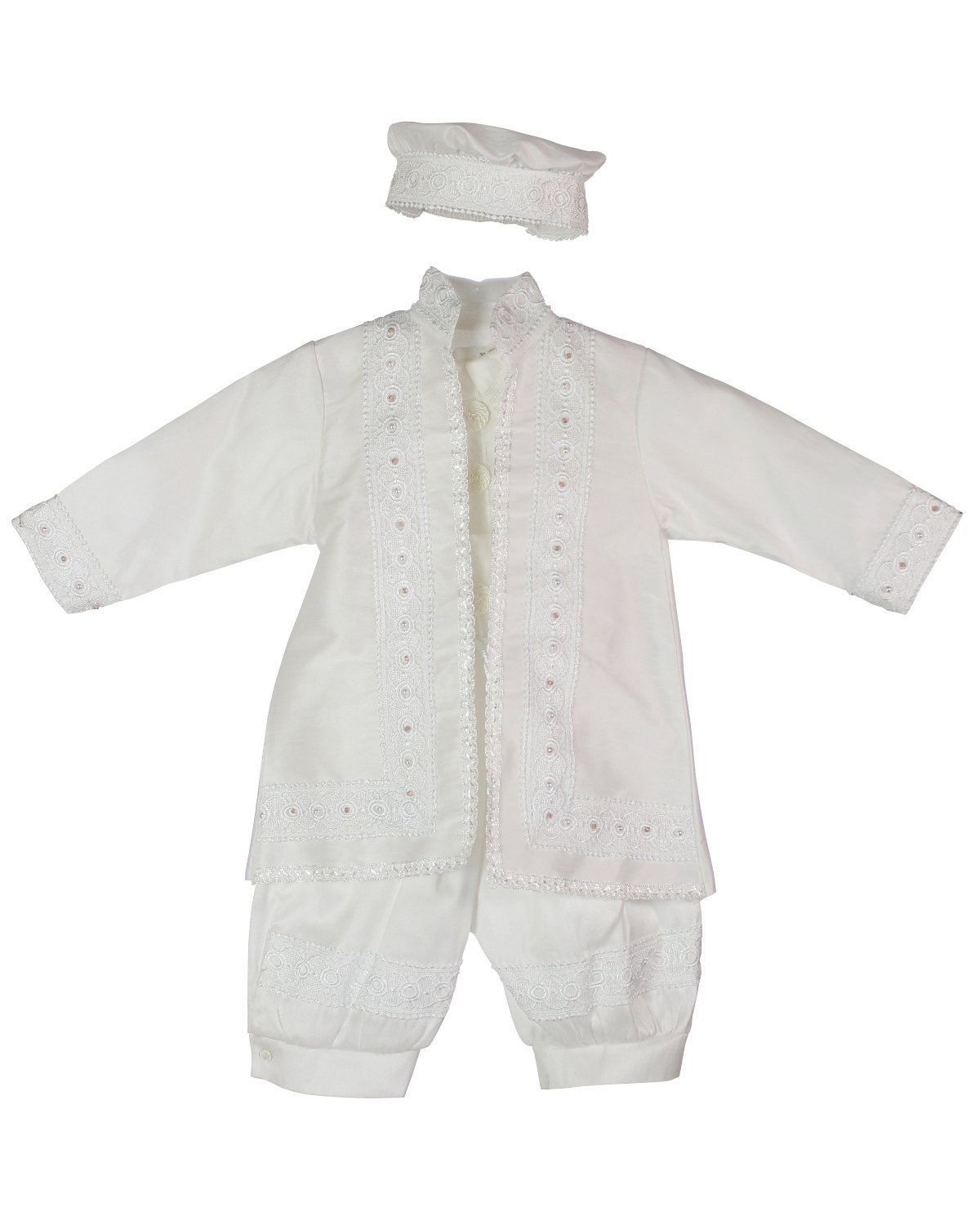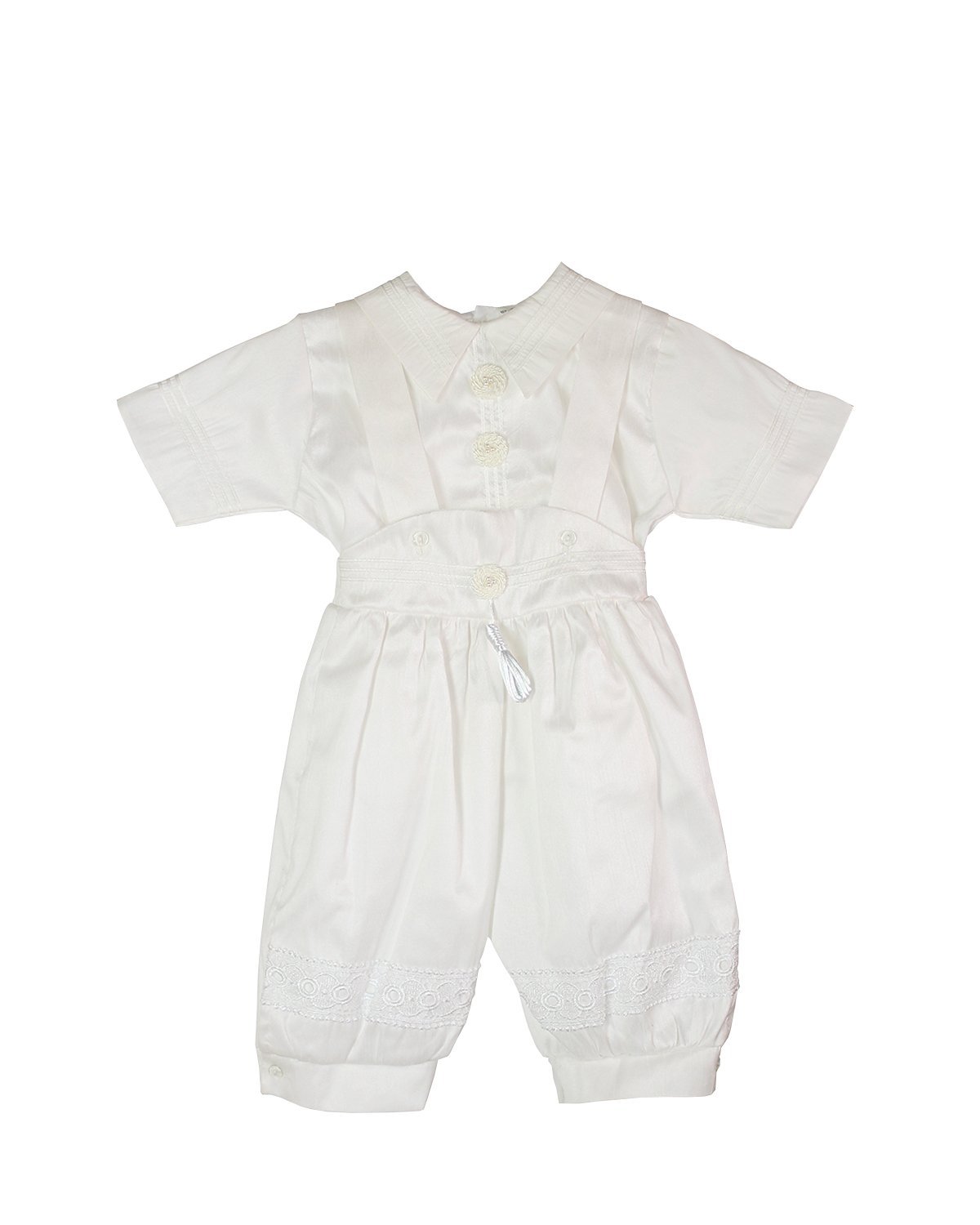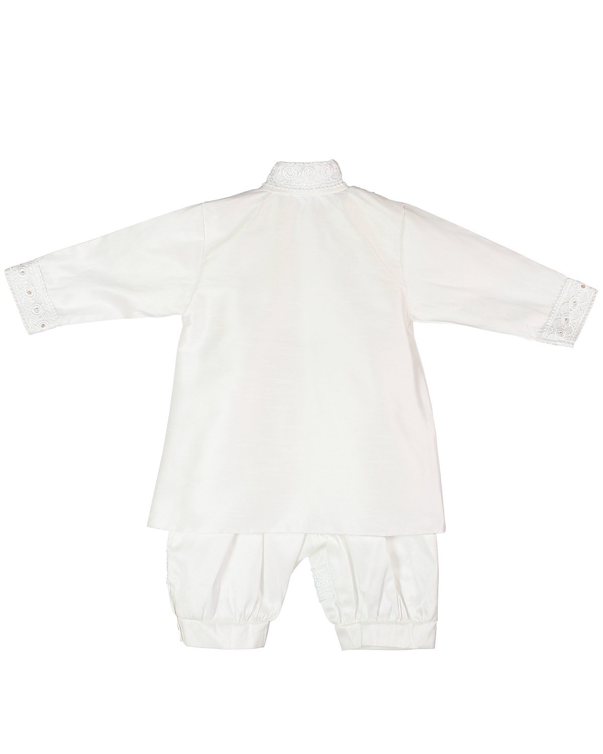 Este ropón de bautizo para niño es un diseño elegante y elaborado en shantung de alta calidad. Cuenta con detalles de guipur bordado y botones en la parte de enfrente para un aspecto impresionante.