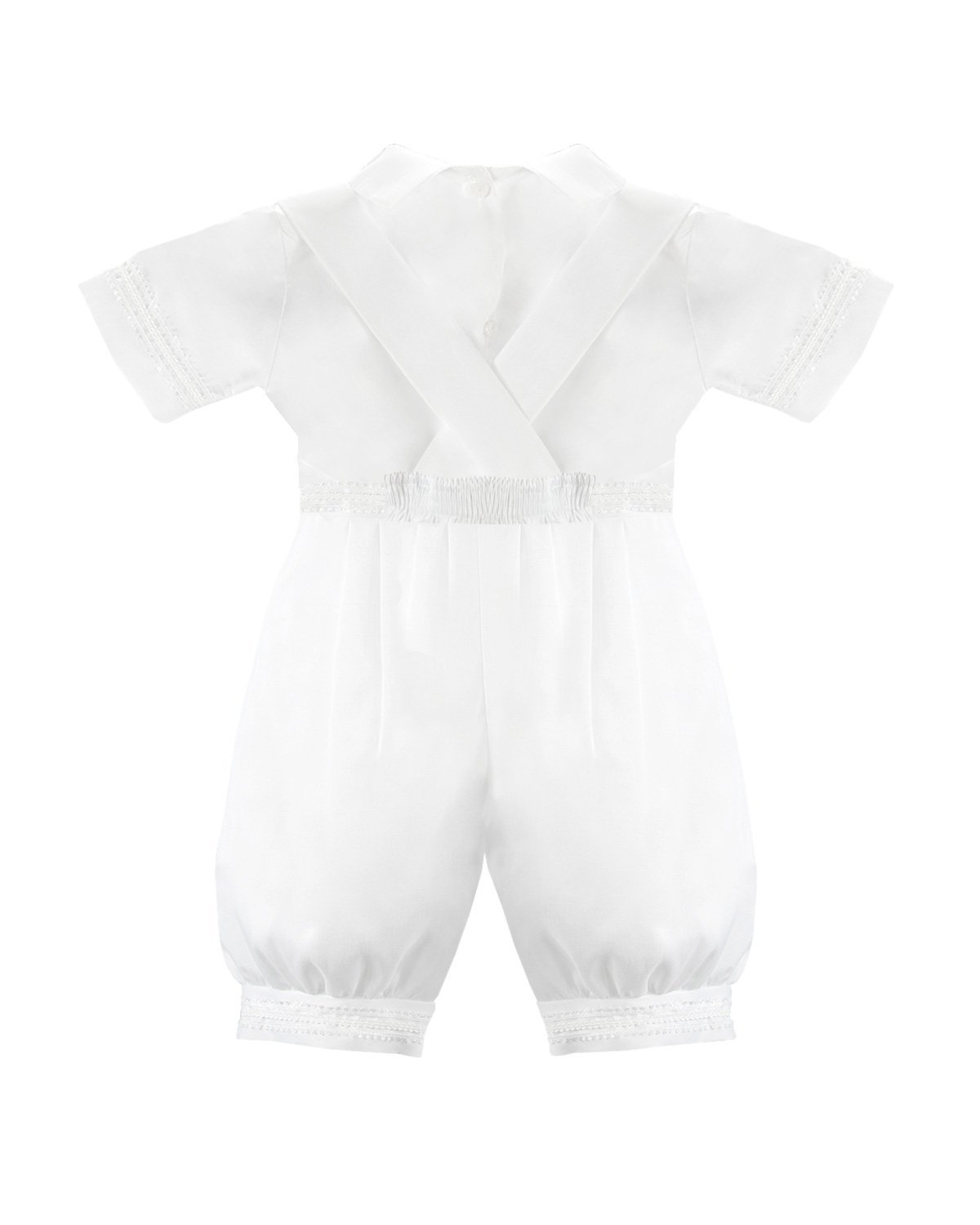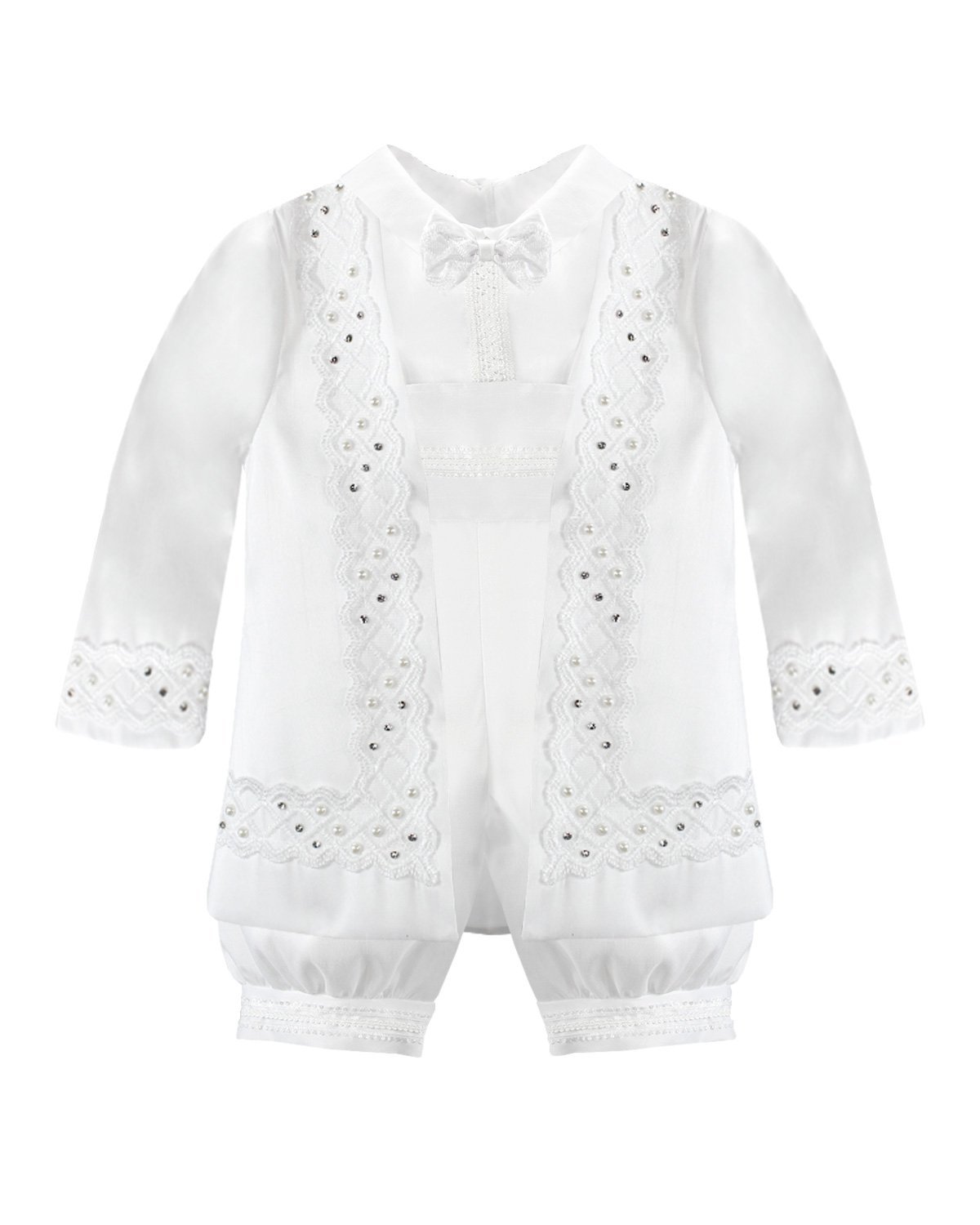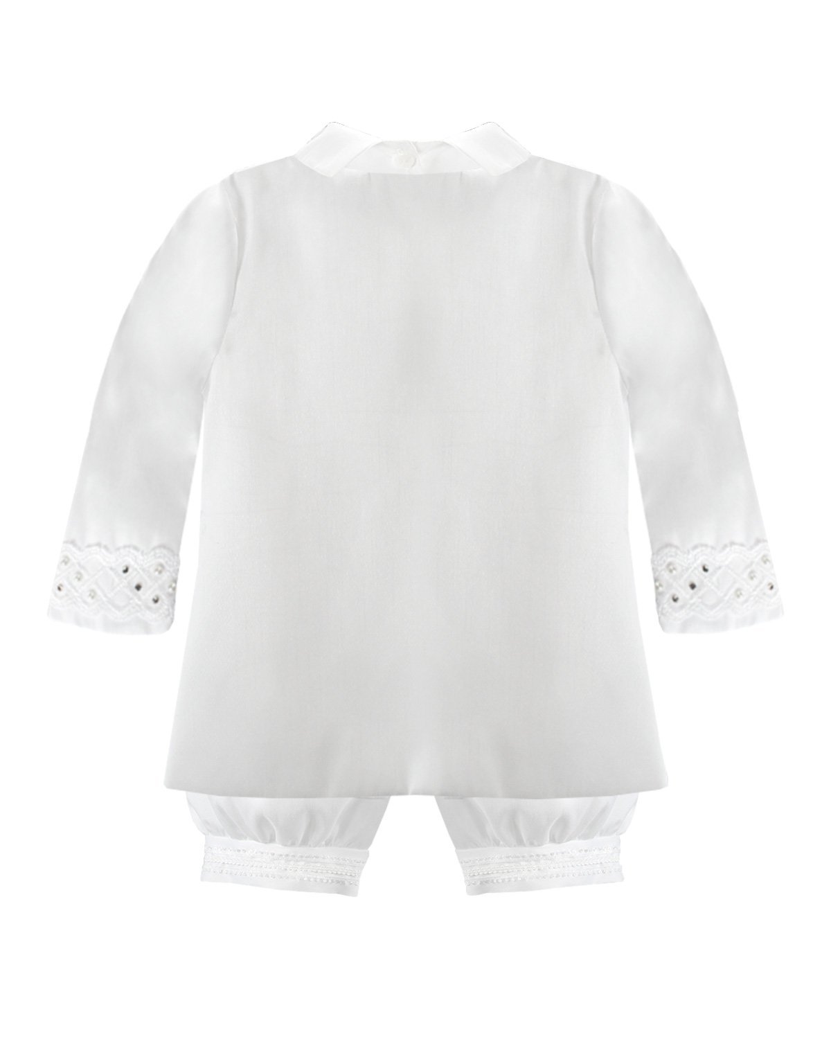 Elegante conjunto de bautizo en shantu con short, camisa decorada y saco adornado con pedrería, perlas, pasamanería y bordados.