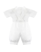 Conjunto de bautizo en shantu con short, camisa decorada y una estola con pedrería, perlas y calado a láser del rostro de Cristo.