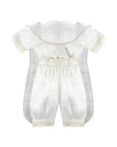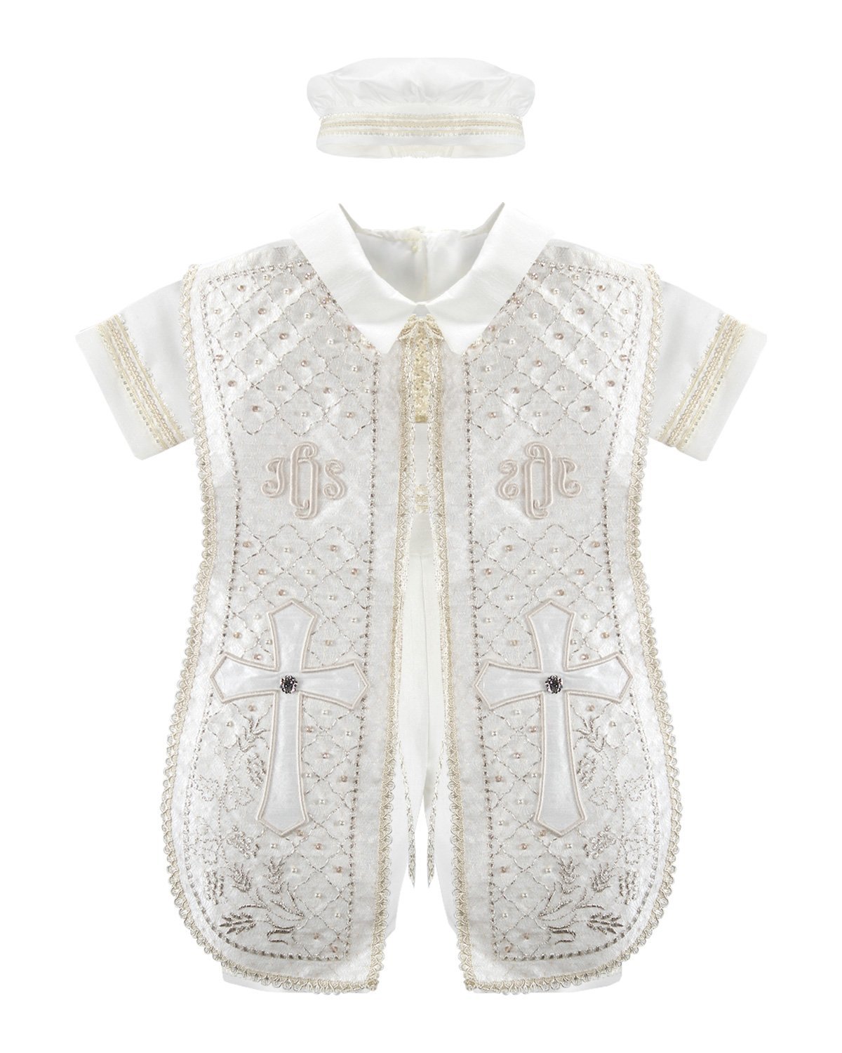 Shantu outfit with puffed shorts, decorative shirt, and a stole with rhinestones, pearls, and embroidery of JHS initials and a cross.