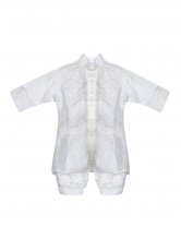 Viste a tu pequeño príncipe con nuestro exquisito ropón de niño. Elaborado en shantung, este conjunto incluye pantalón y camisa finamente bordados. El saco de shantung cuenta con bordados intrincados y una cenefa elegante. Perfecto para ocasiones especiales, nuestro ropón de niño garantiza una apariencia encantadora y distinguida.