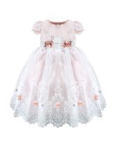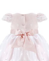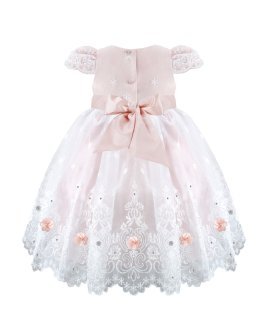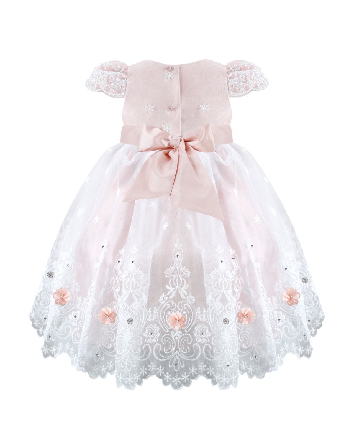 Isabel Baby Dress with embroidered tulle, lace details, and floral waistband. Perfect for special occasions.